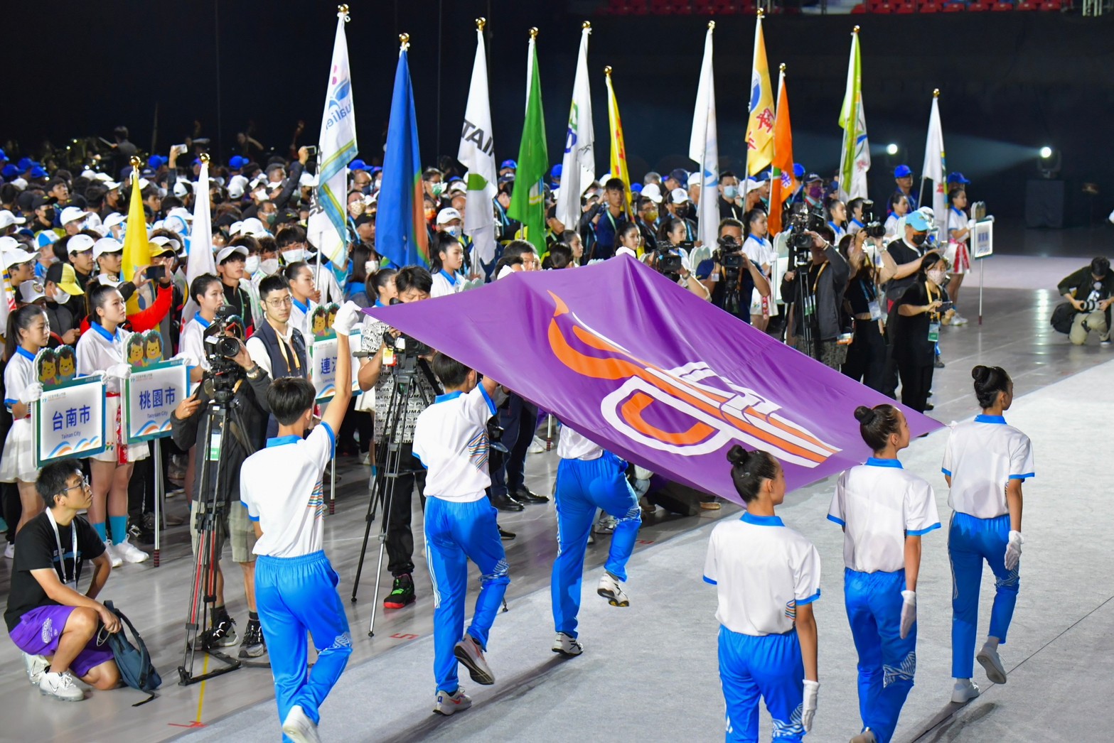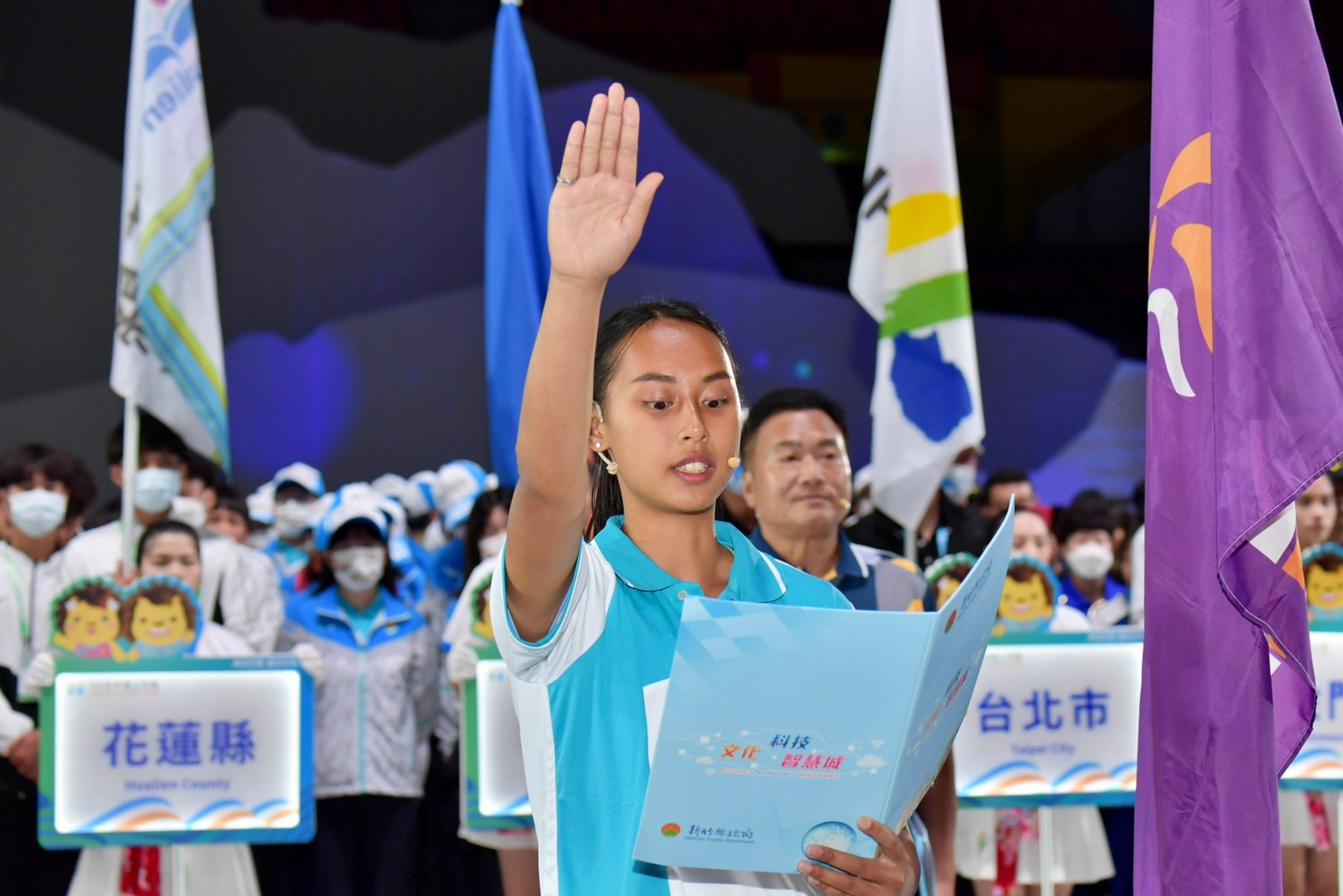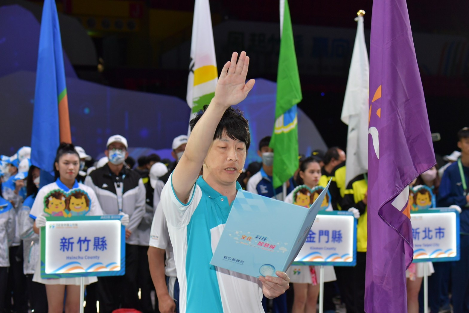 隨後,大會會旗進場並冉冉升起,運動員代表東泰高中鄒淑珺、裁判代表孫光明、教練代表張添煜分別宣誓,並由新竹縣芎林國中林沛萱及湖口高中徐立紘等2位同學擔任聖火手引燃聖火,氣氛歡欣熱烈。