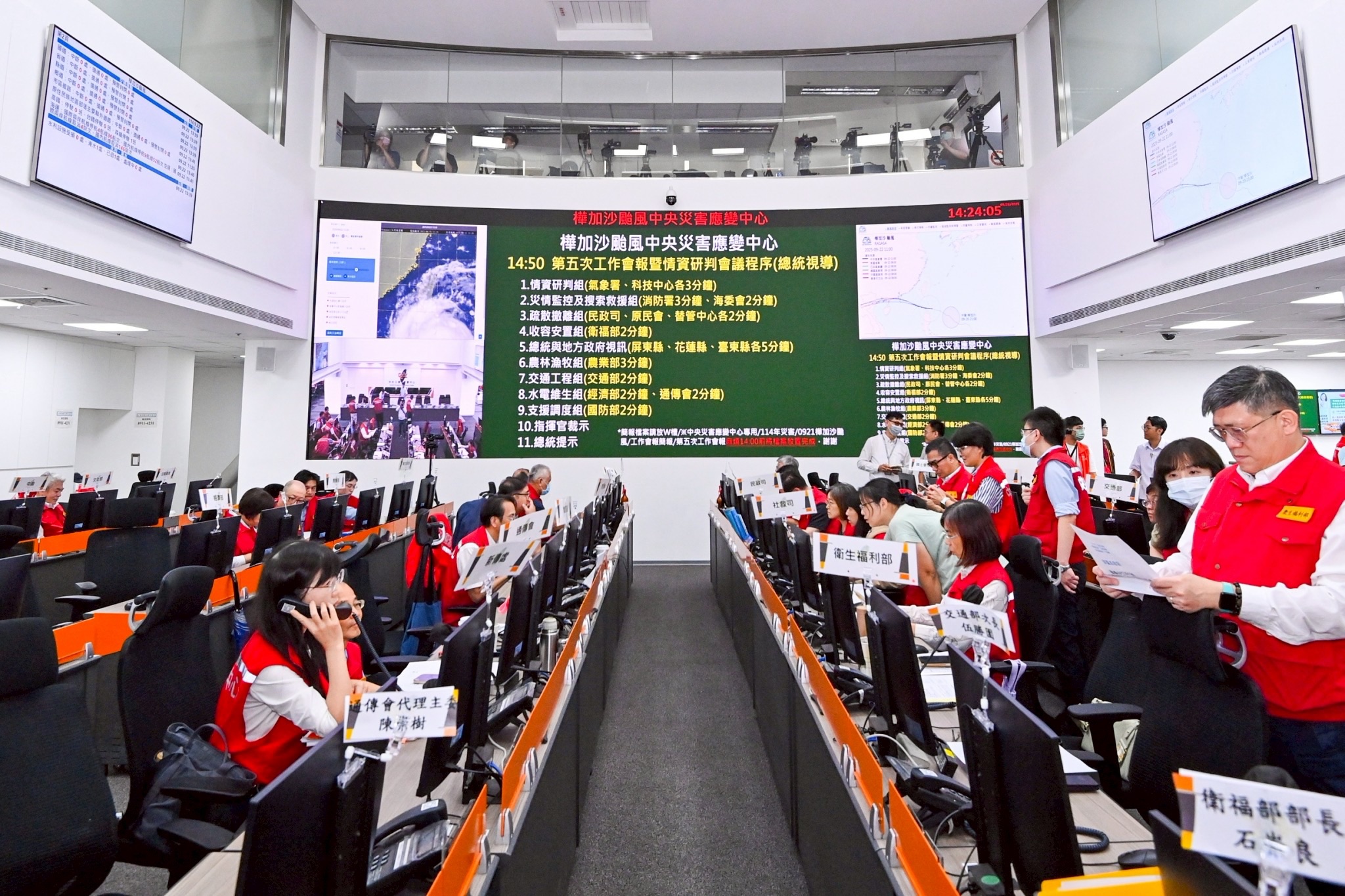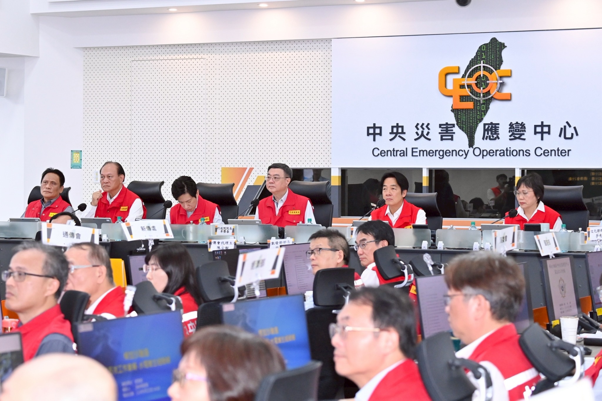 總統、卓院長抵達中央災害應變中心後,首先聽取情資研判組、災情監控及搜索救援組、疏散撤離組、收容安置組等功能分組報告,並與屏東縣周春米縣長、花蓮縣顏新章副縣長、臺東縣饒慶鈴縣長視訊連線。視訊結束後,總統、卓院長接續聽取農林漁牧組、交通工程組、水電維生組與支援調度組等功能分組防災整備及應變作為報告。