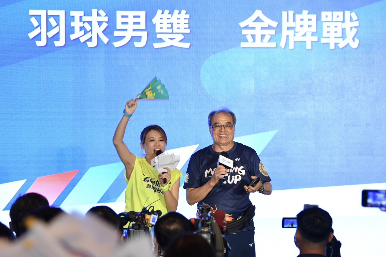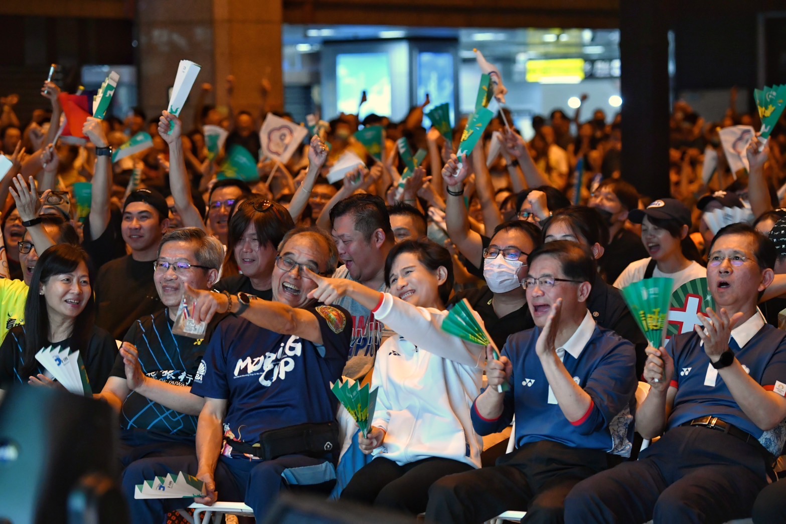 鄭副院長抵達後,與現場球迷及嘉賓一同觀賞李洋父親李峻淯在巴黎錄製的應援影片,其中提到他與李洋來自戰地金門,受到臺灣社會照顧,才能站上國際舞臺,並感謝大家對羽球的支持,同時也特別向李洋溫情勉勵:「洋洋,全力以赴!要讓中華隊得意!」