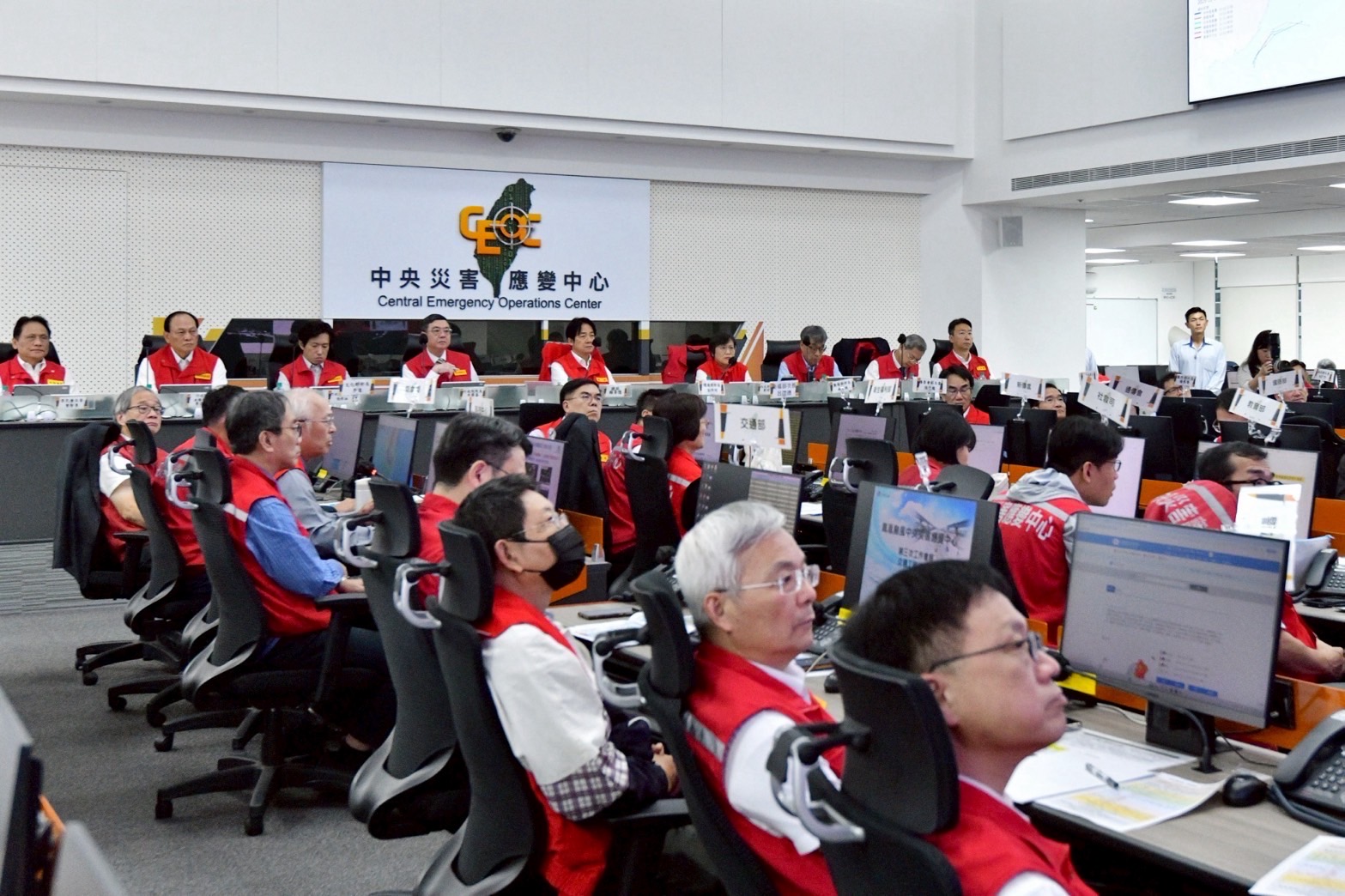 總統、卓院長抵達中央災害應變中心後,首先聽取情資研判組、災情監控、搜索救援及支援調度組、農林漁牧組、水電維生組、交通工程組、疏散撤離組、收容安置組等功能分組報告,並與新北市侯友宜市長、花蓮縣徐榛蔚縣長、宜蘭縣林茂盛代理縣長視訊連線。