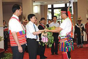 今天的接見氣氛熱烈愉悅,在花蓮縣政府原住民行政處團隊的載歌載舞聲中,活動最後高潮由阿美族頭目致贈院長原住民傳統服飾作為信物,同時邀請院長與原住民舞者共舞,共同為花蓮原住民A DA WANG聯合豐年節巴達固斯(報信息)活動祝褔。今日陪同劉院長出席活動的有行政院原住民委員會章仁香。
