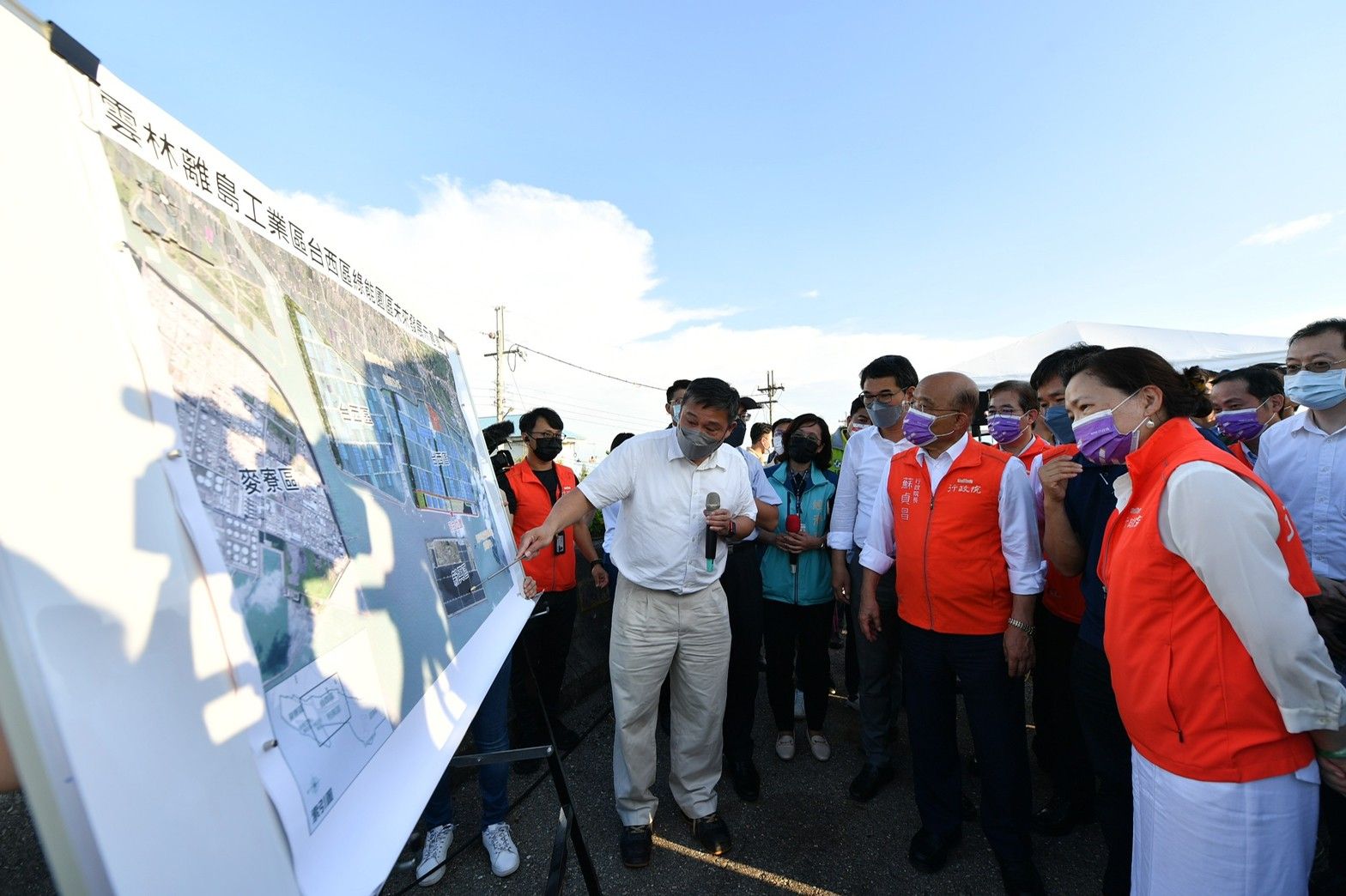 此行蘇院長首先聽取經濟部工業局呂正華局長簡報「台西區綠能園區電漁共生推動方案」,並於致詞結束後進行現地視察,由呂局長以該園區模擬示意圖,向院長介紹園區的未來發展。