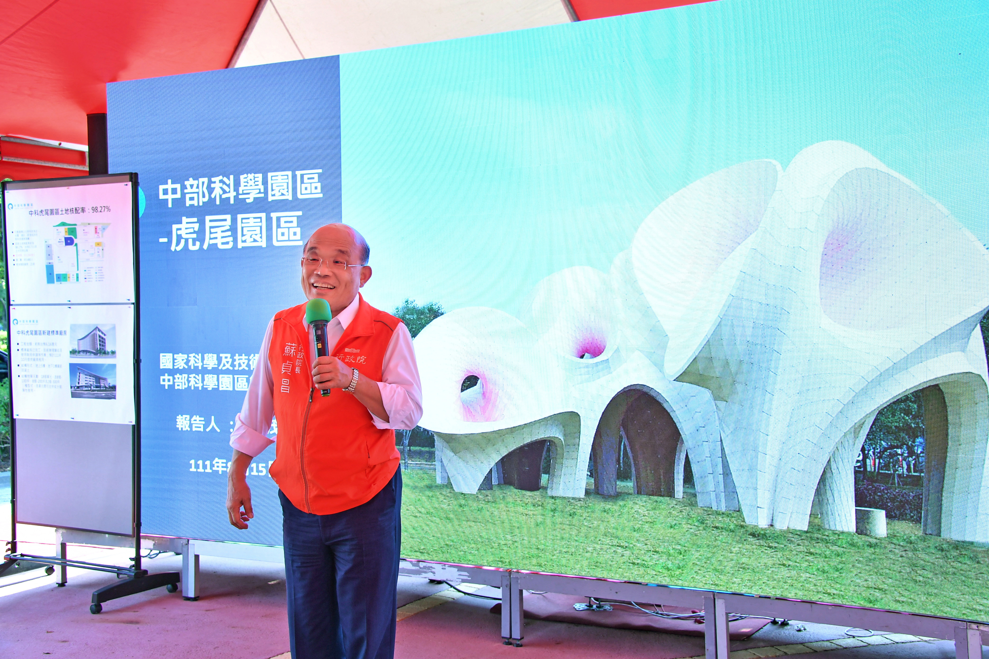 蘇院長抵達虎尾園區後,首先聽取中科管理局許茂新局長簡報該園區整體規劃及發展,並於致詞時感謝各大廠商投資中部科學園區,讓中科整體營收在去年即突破兆元,蘇院長表示,政府的責任就是持續提供各種最好的條件,並與企業夥伴共同合作,讓臺灣更具世界競爭力,在世界占有重要的一席之地。