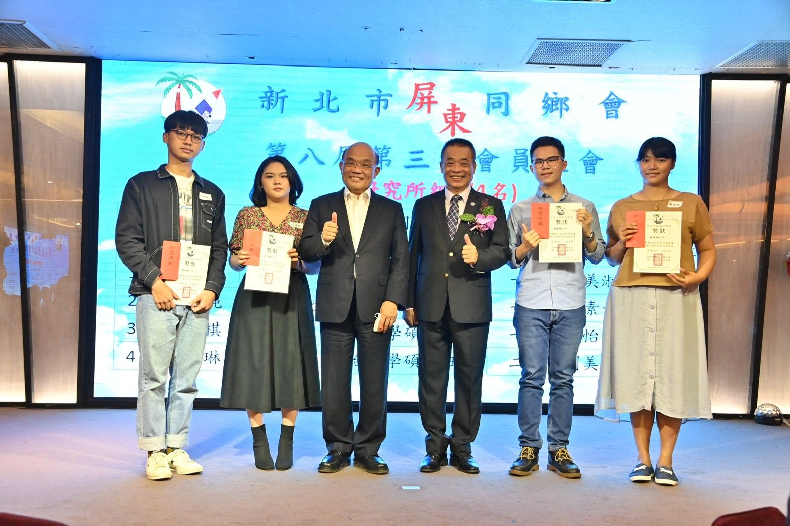 談到稍早全場屏東鄉親合唱的「屏東之歌」,蘇院長指出,這首「屏東之歌」是他擔任屏東縣長時,請音樂家簡上仁先生作曲,其中一段歌詞「屏東是我們的家」是以國語、臺語、客語及原住民語等4種語言傳唱,象徵屏東的4大族群,並藉由歌詞體現出屏東是一個好地方。隨後,院長也頒發同鄉會4位優秀子弟研究所組獎學金與獎狀,並與屏東同鄉會成員合影。院長希望屏東能愈來愈好,從臺灣頭好到臺灣尾,也祝福屏東鄉親皆能發展順利。