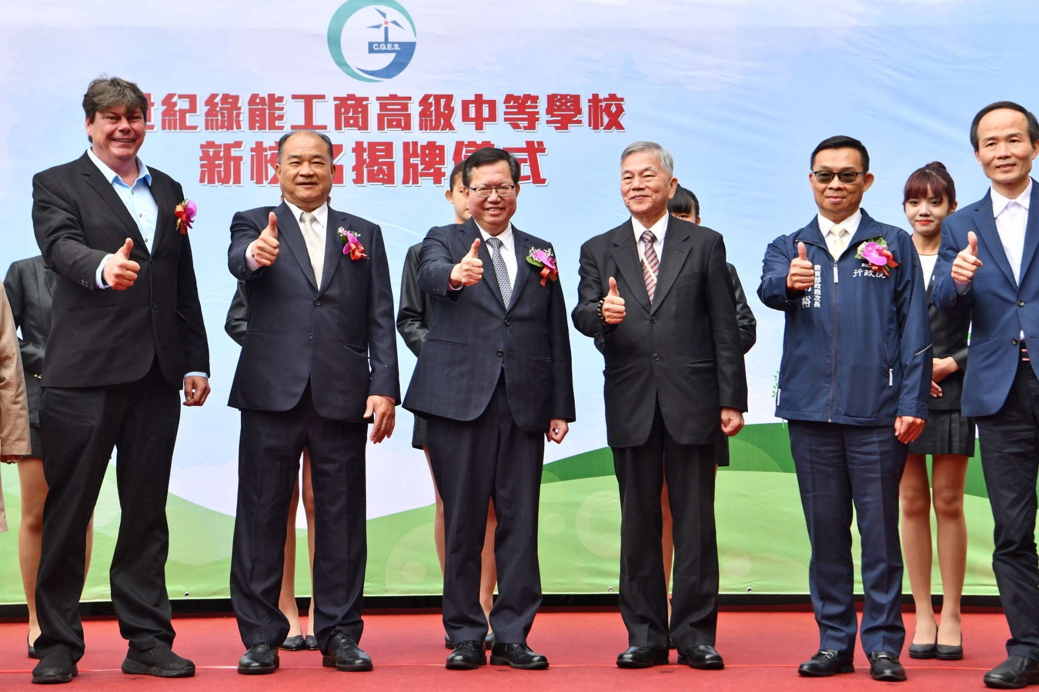 鄭副院長並感謝丹麥哥本哈根基礎建設基金(CIP)、沃旭能源以及達德能源等風電產業相關企業的大力支持。今日桃園「成功工商」改名「世紀綠能工商」揭牌典禮在學生們精彩的舞龍舞獅表演中揭幕,場面熱絡,座無虛席。鄭副院長與世紀集團董事長賴文祥、校長陳崑玉、臺灣金控董事長沈榮津、教育部次長林明裕等人一同參與盛大的揭牌儀式,並於合影留念後離開。