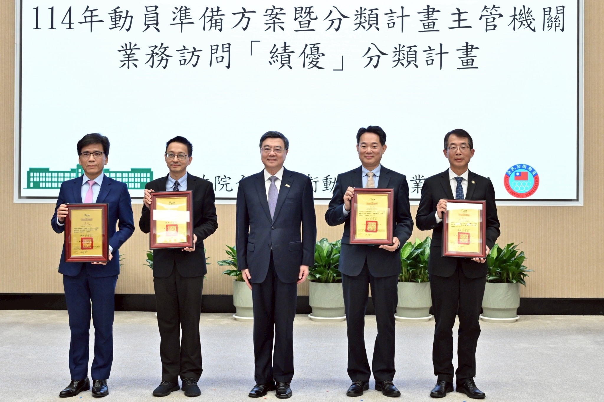 卓院長於會前先觀賞動員紀實影片,並頒獎表揚2025城鎮韌性(全民防衛動員) 演習兵棋推演、綜合實作及(防空)演習「特優」單位,以及114年度動員方案暨分類計畫主管機關業務訪問「績優」單位、協助全民防衛動員準備事務民間有功單位,以及推動全民防衛動員準備事務績優人員等。