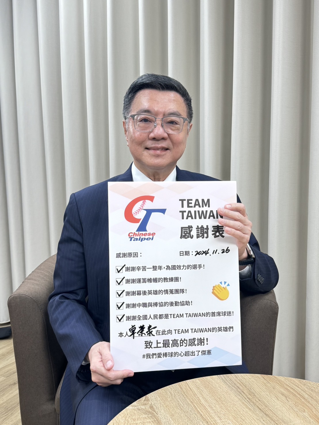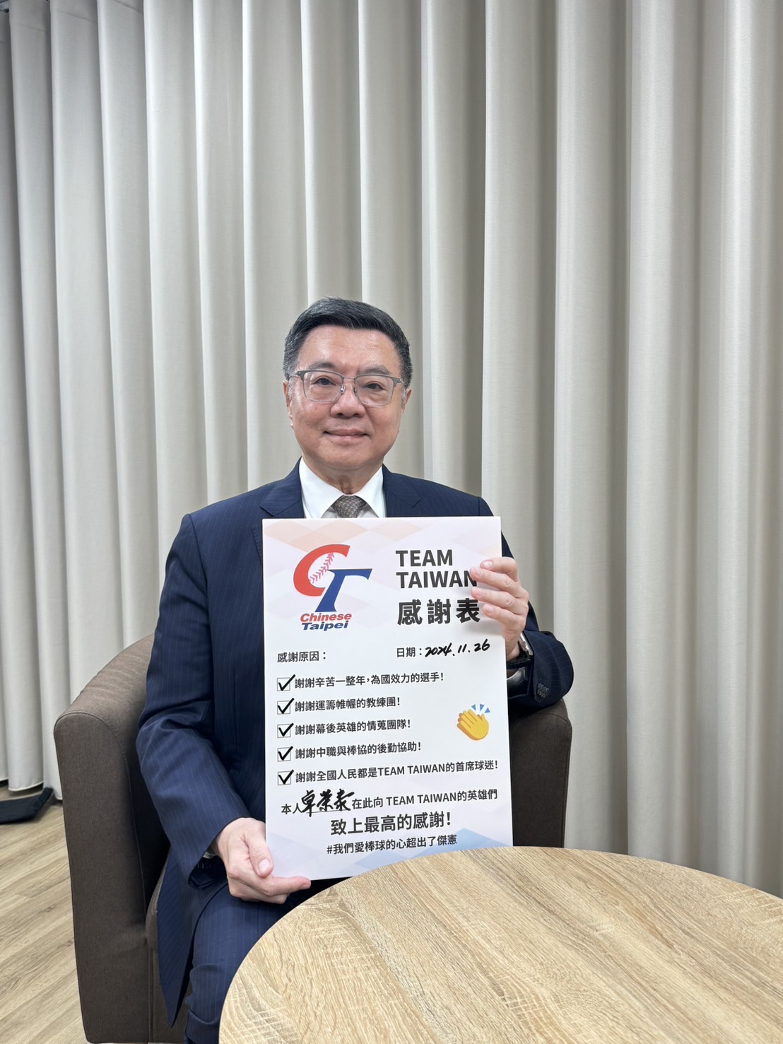 卓院長也感謝曾豪駒總教練,在比賽期間從容不迫、運籌帷幄,穩定了軍心;此外,林岳平教練使用車輪戰術,精準調配先發與牛棚選手,讓對手看到臺灣隊堅強的實力。