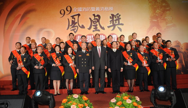 行政院長吳敦義今(19)日出席99年全國消防暨義消楷模「鳳凰獎」表揚典禮,他勉勵獲得鳳凰獎的全國消防、義消楷模們繼續把光榮職責扛在肩膀上,保障國人生命與社會的安全。