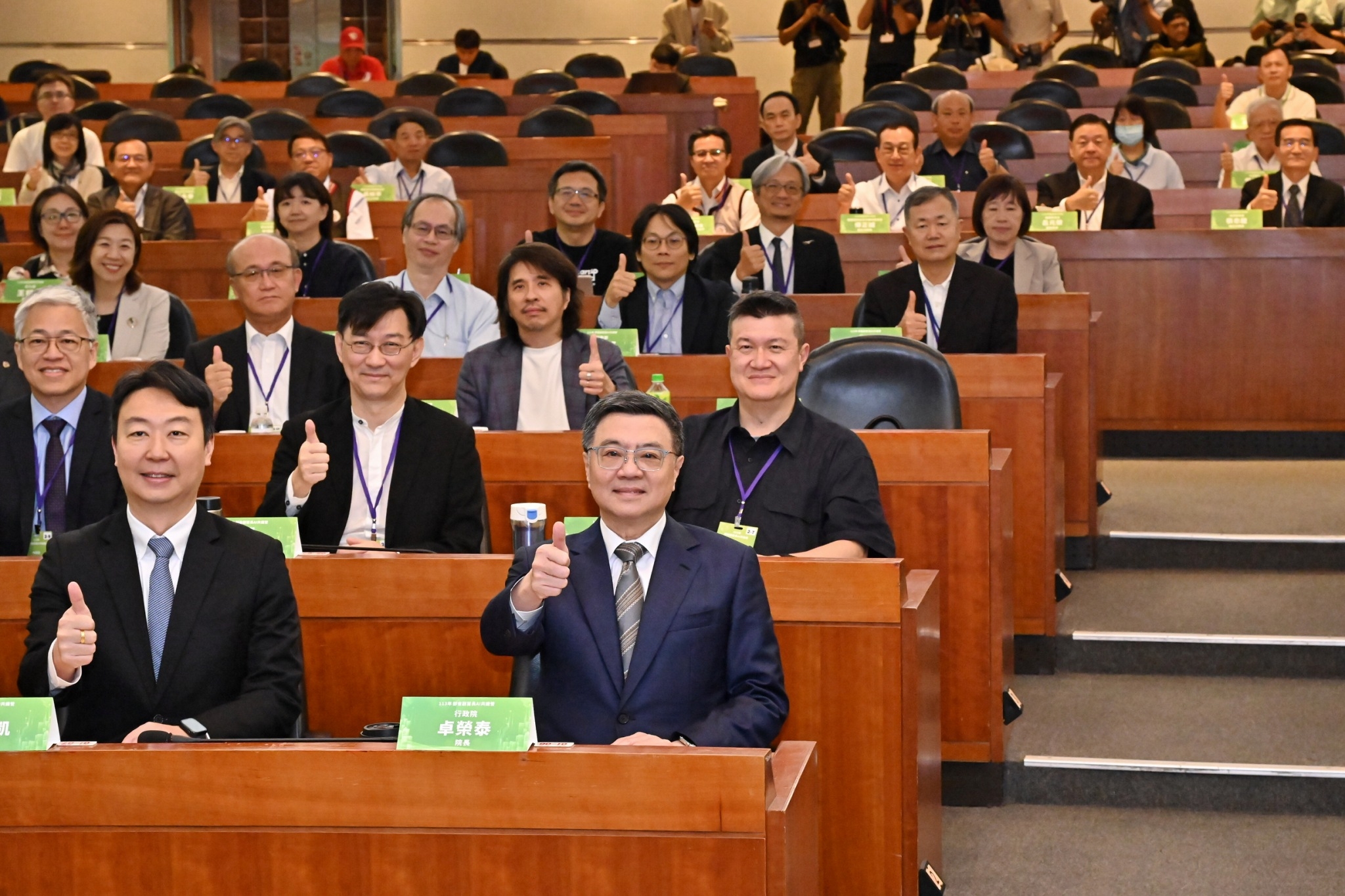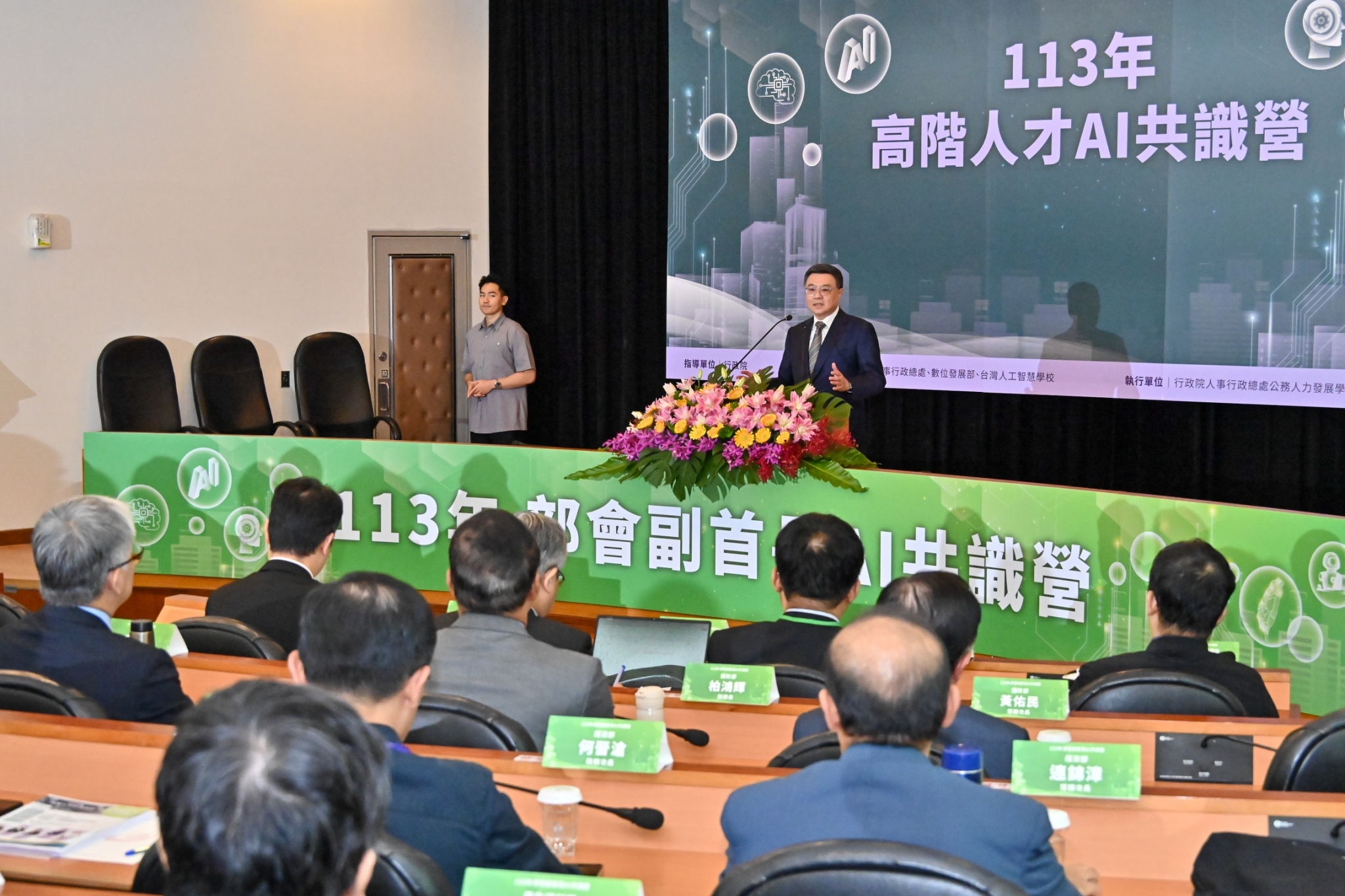 此行,卓院長到場後,首先偕同行政院陳世凱發言人、行政院人事行政總處蘇俊榮人事長,以及發表專題演講的國立臺灣大學科技政策與產業發展研究中心詹文男執行長、中央研究院資訊服務處陳伶志處長、臺灣人工智慧學校蔡明順校務長,與參與共識營的各部會副首長合影留念。
