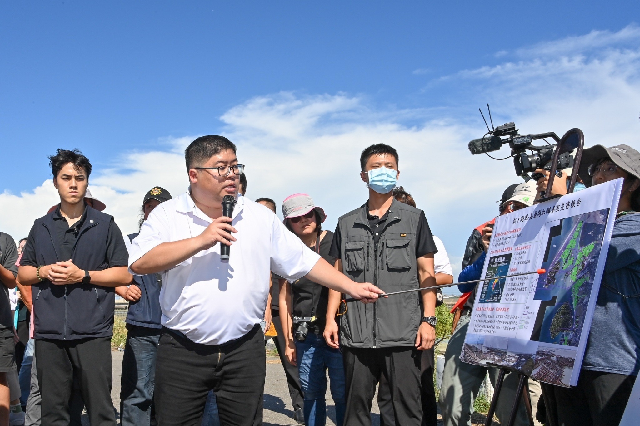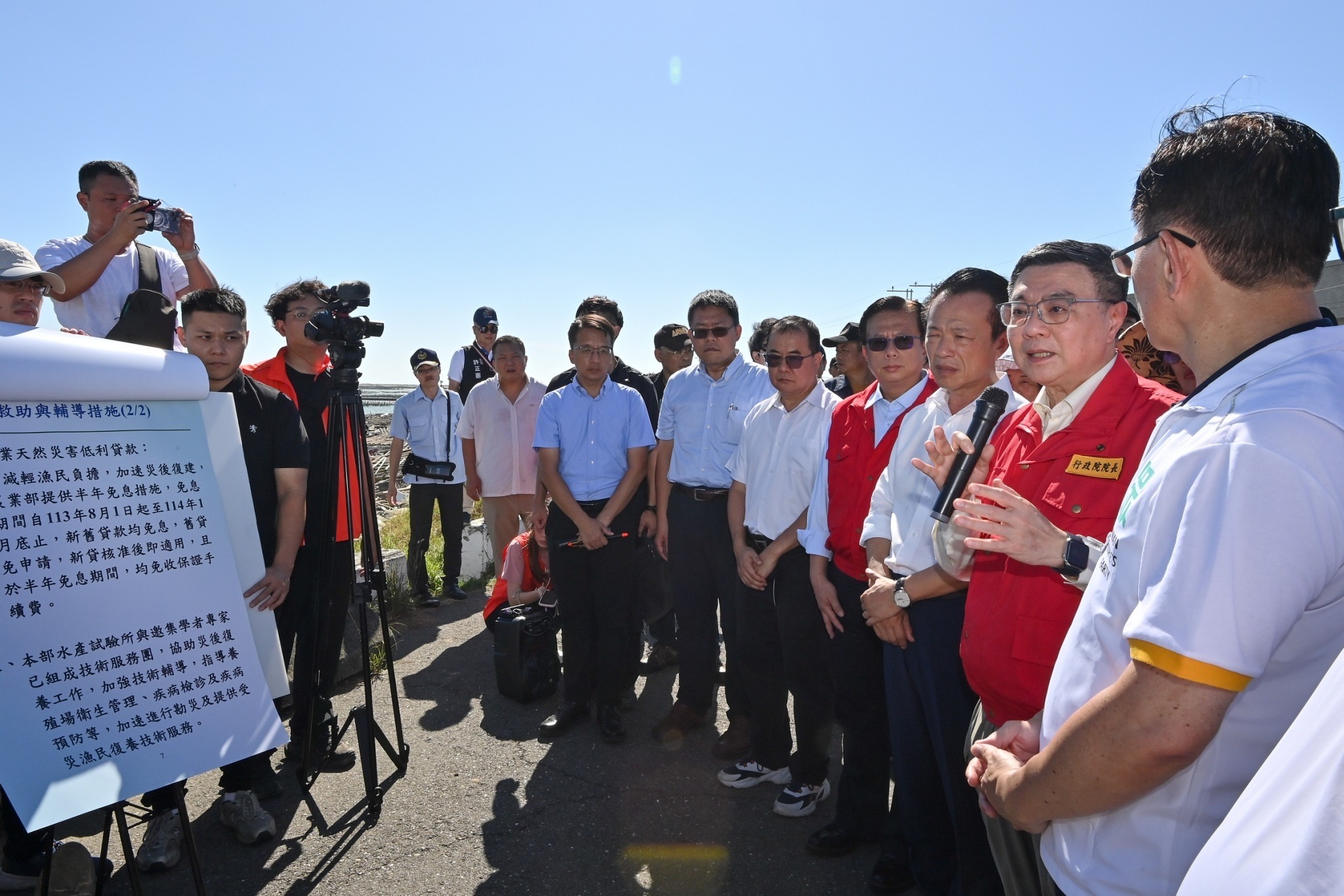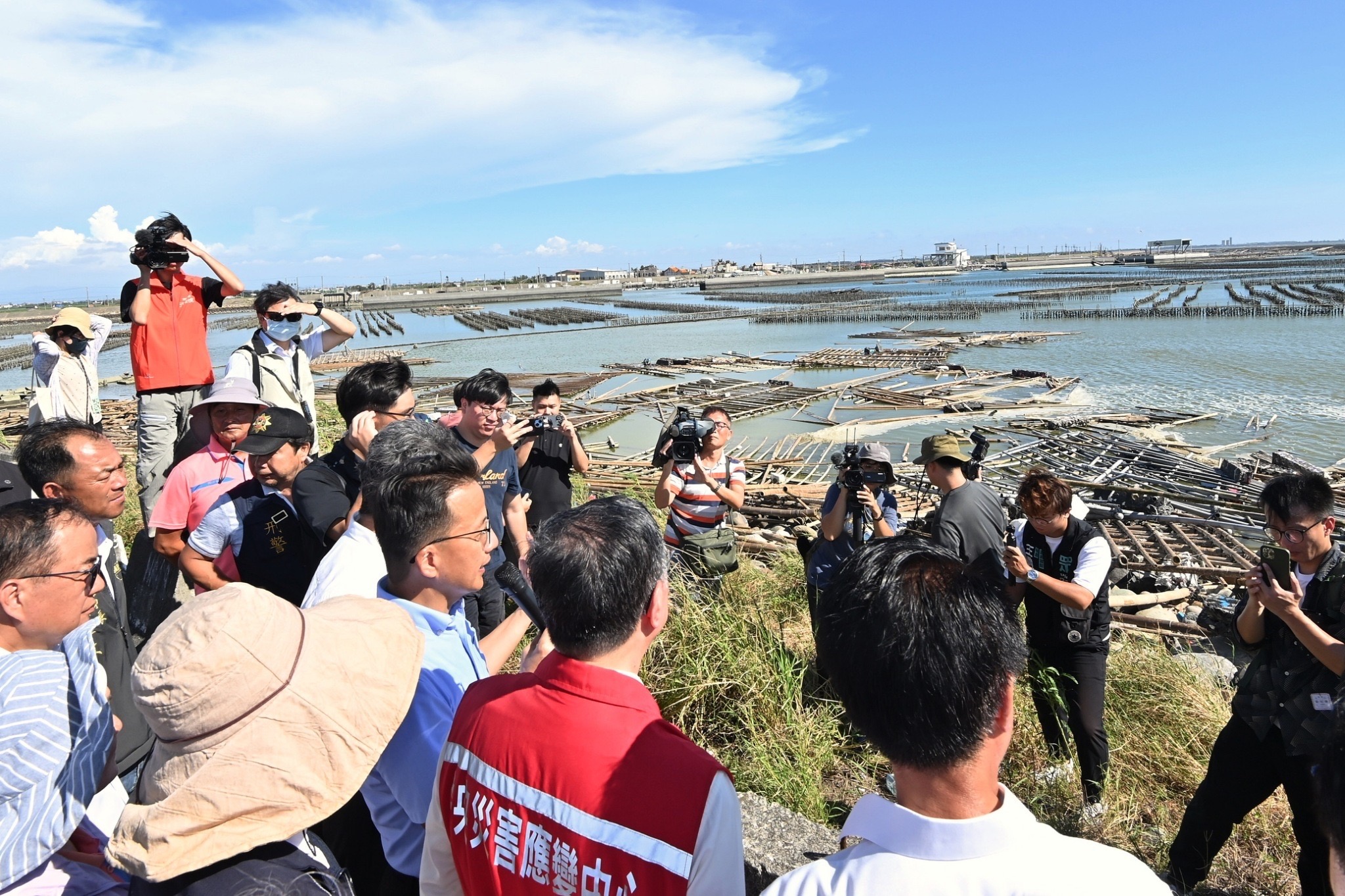致詞結束後,院長偕同行政院龔秘書長、農業部黃昭欽次長、漁業署張署長、行政院雲嘉南區聯合服務中心李碧菁副執行長、張啓楷立委、蔡易餘立委、嘉義縣翁章梁縣長、嘉義縣議會陳怡岳副議長、姜梅紅議員及嘉義縣東石鄉公所林俊雄鄉長等人,在嘉義縣政府農業處張建成科長陪同解說下,於海堤旁現地視察蚵棚,了解災損狀況。