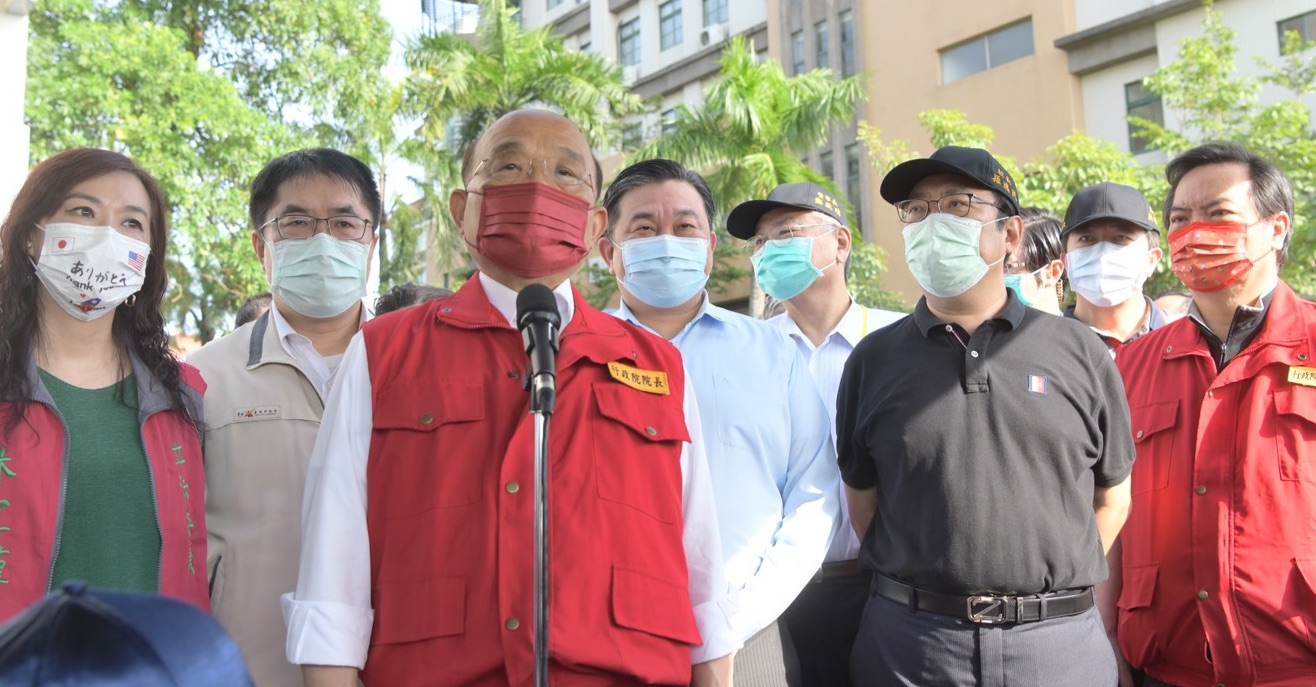 稍晚,蘇院長前往彰化關切芳苑鄉新街排水淹水情形時表示,老天爺給我們考驗,一個多月前政府仍在抗旱,現在卻在防汛,幸好蔡總統編列前瞻水環境建設,大幅縮小淹水面積,例如臺南三爺溪淹水情形已大幅改善;以及屏東大仁科技大學附近,淹水面積從3年前的30公頃,縮減為1.7公頃。