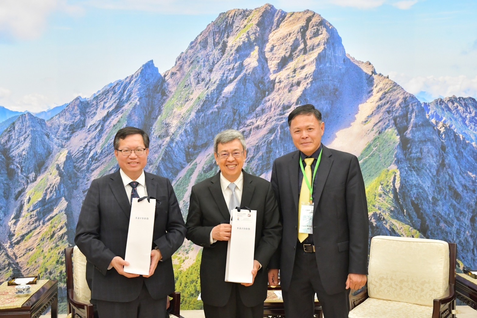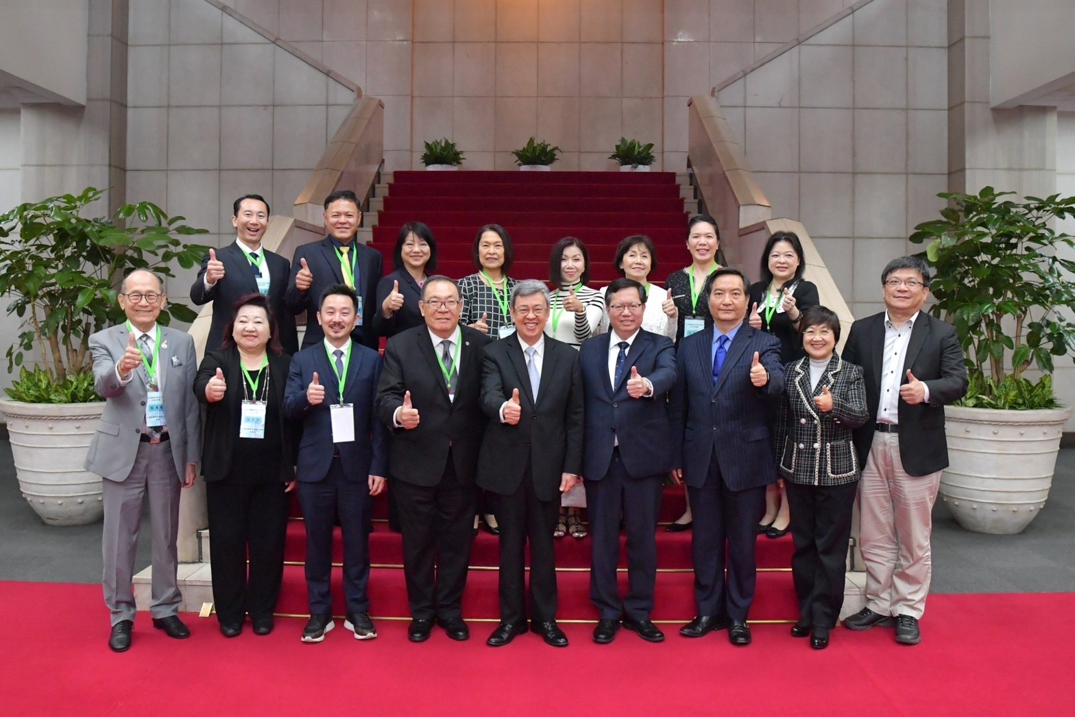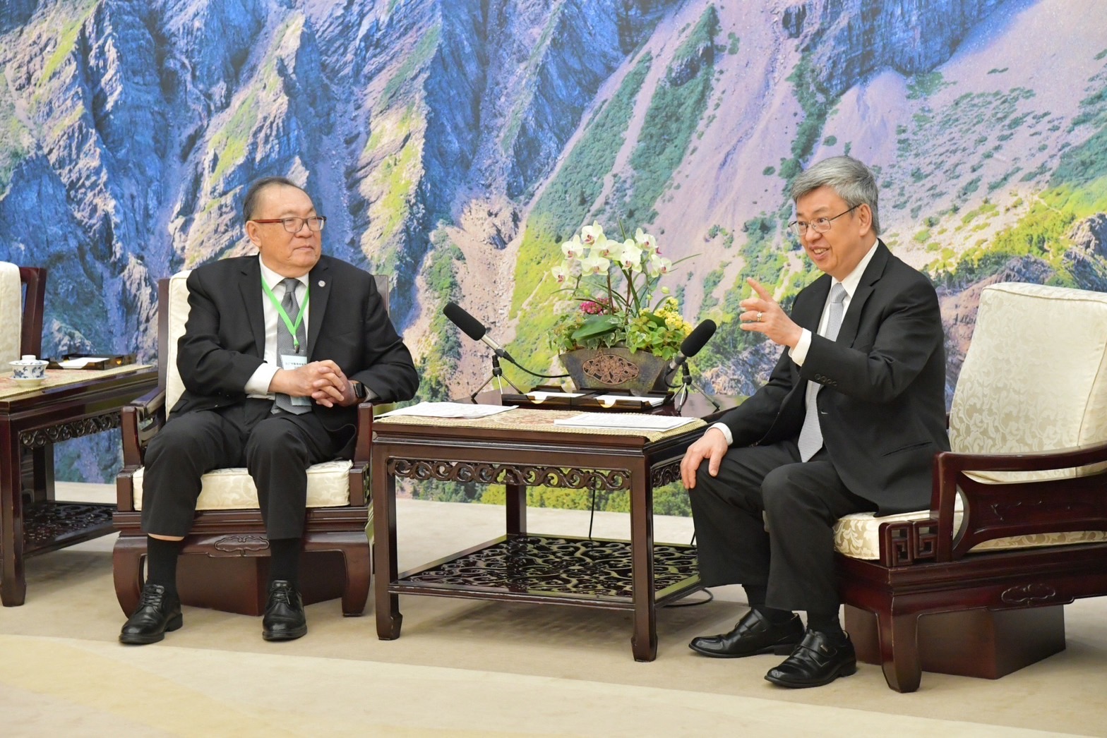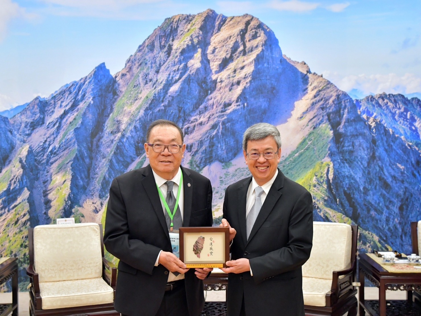 訪賓一行由僑務委員會委員長徐佳青陪同,前來行政院拜見陳院長,行政院副院長鄭文燦、政務委員兼代理發言人羅秉成、經濟部次長曾文生也在座;吳總會長致贈院長「琉璃紙鎮」,陳院長則回贈吳總會長「臺灣瑰寶—掛畫桌飾」,雙方並合影留念。