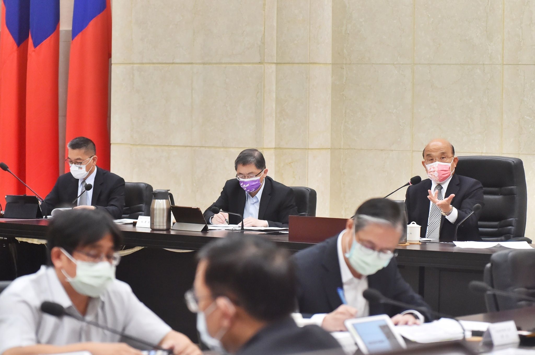 針對內政部警政署及法務部「111年地方公職人員選舉治安維護與查賄制暴工作」報告,蘇院長指出,本次選舉共有9項地方公職人員選舉同時舉行,種類多且參選者眾,另亦結合憲法修正案公民複決第1案(18歲公民權)舉辦,投開票所數量高達1萬7,600多處,為歷年之最,因此選務及維安工作難度升高,請各有關單位全力以赴,審慎因應。