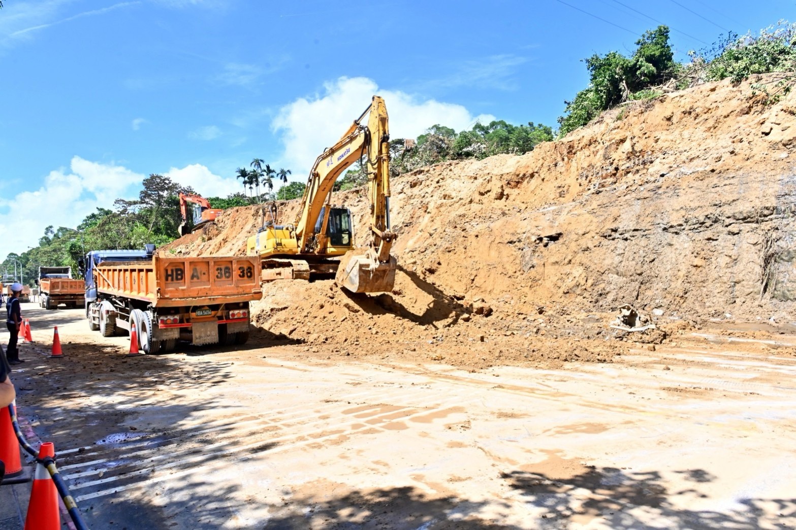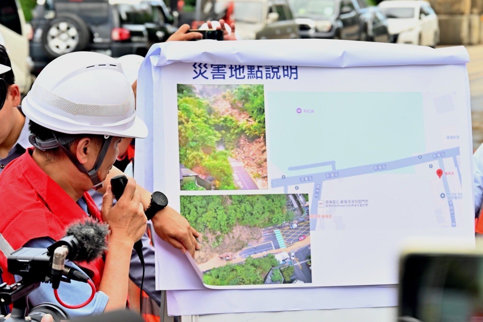 卓院長抵達基隆海中天社區附近後,分別聽取內政部國土管理署蔡亦強組長及基隆市政府工務處陳耀川處長說明海中天社區道路邊坡坍塌與搶救進度簡報。目前新豐街北側邊坡土石滑落,滑落範圍面積估計約5,000平方公尺,由於土石覆蓋新豐街約100公尺,雙向無法通行,而該路段為周邊社區前往台62甲線及市區的重要通道,因此基隆市中正區公所及基隆市府工務處正積極處理,預計今晚8時前完成道路搶通工程,讓市民正常通勤及通學。