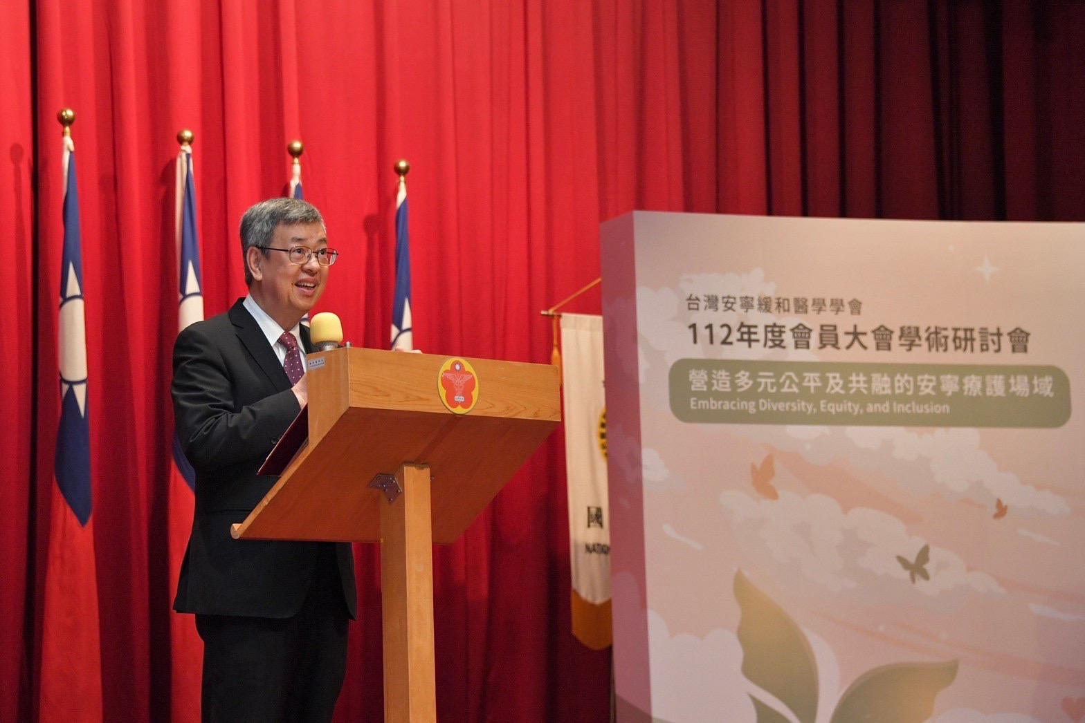 行政院長陳建仁今(15)日出席「台灣安寧緩和醫學學會112年度會員大會學術研討會」時表示,本次研討會主題強調多元、平等與包容,期盼與會者踴躍分享寶貴知識與經驗,將安寧緩和醫療照護做得更好。院長強調,政府多年來逐步推動多項安寧緩和醫療政策,持續改善醫療團隊品質,並重視末期病人的自主權利,而安寧緩和醫療照護是一門融合科學與藝術的醫療領域,希望未來能夠做好全人照顧,營造共融環境,讓末期病人生命在轉變過程中留下尊嚴,也為家屬留下美好回憶。