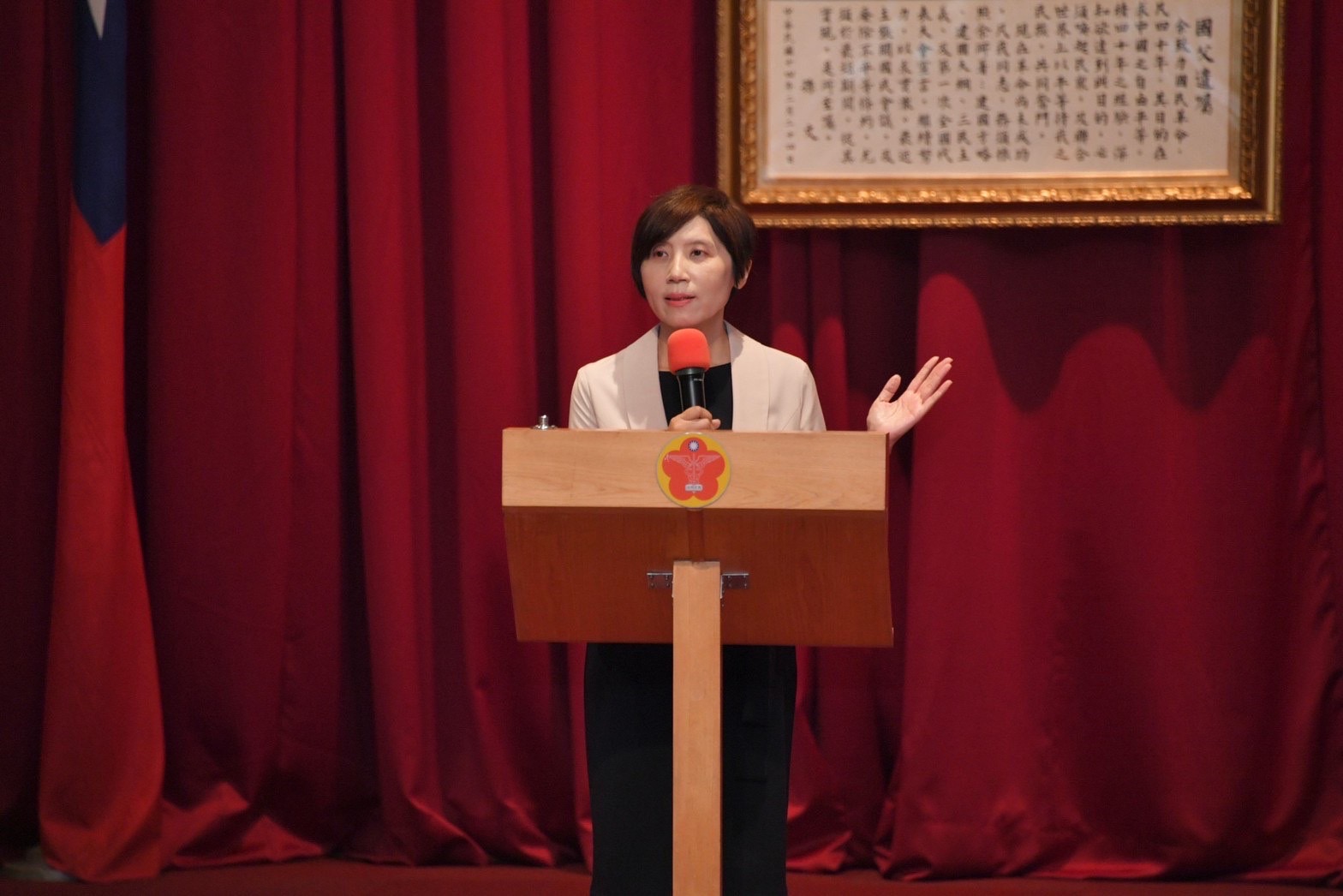 致詞結束後,陳院長與行政院林子倫發言人、衛生福利部薛瑞元部長、邱泰源立法委員、國防醫學院陳元皓院長、台灣安寧緩和醫學學會程劭儀理事長等貴賓及所有會員,於座位上合影留念,為研討會揭開序幕。