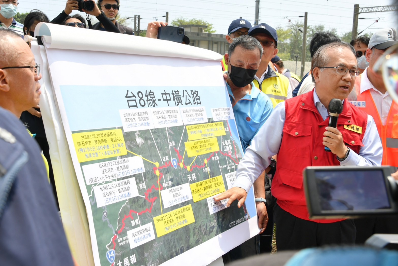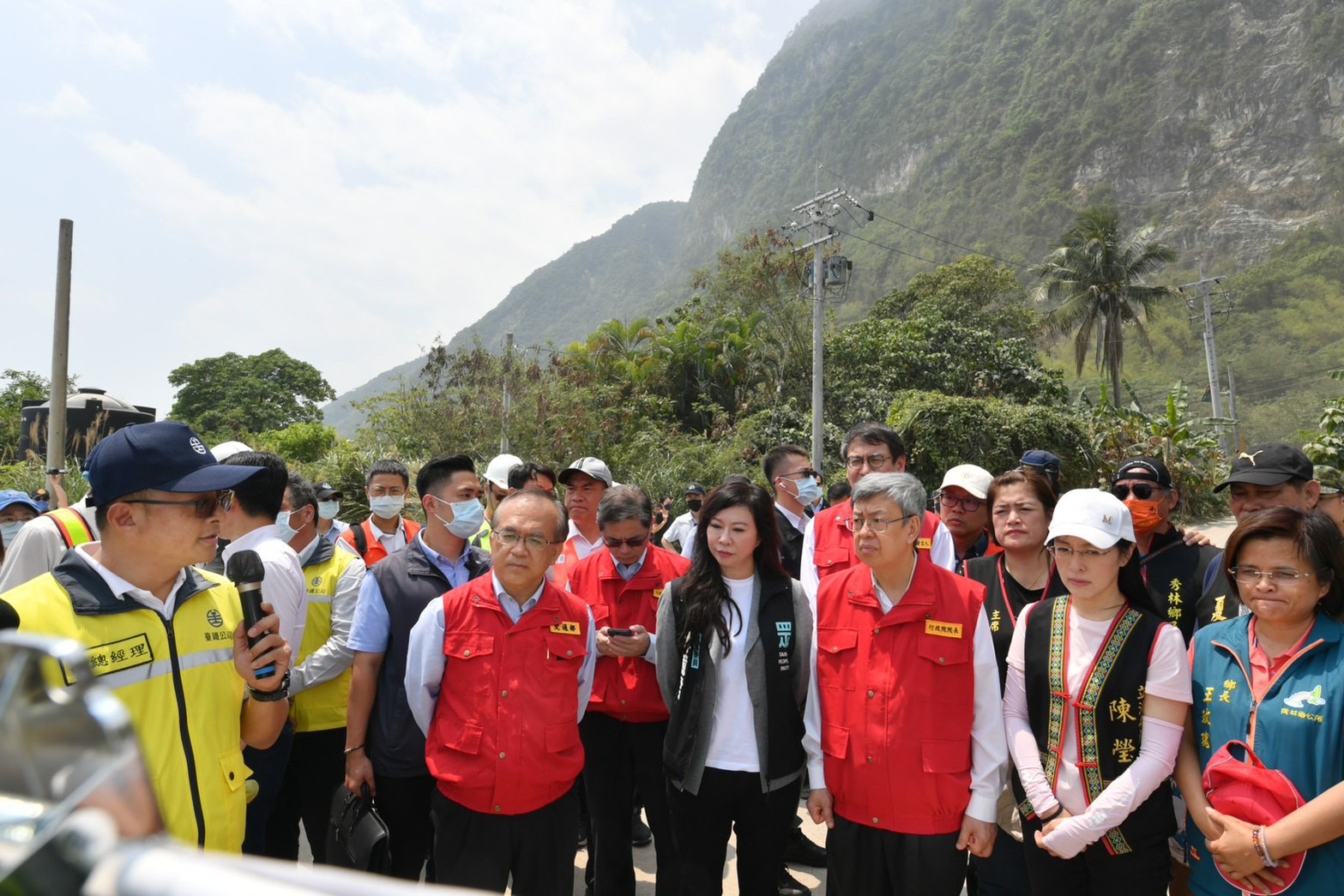 此行,陳院長也趕赴花蓮縣秀林鄉崇德火車站,先後聽取臺鐵公司陳宗宏副總經理說明臺鐵災後搶修及與蔬果北運等規劃,以及交通部公路局陳進發總工程司說明台9線158.6K(下清水橋)與台8線中橫公路搶修進度。