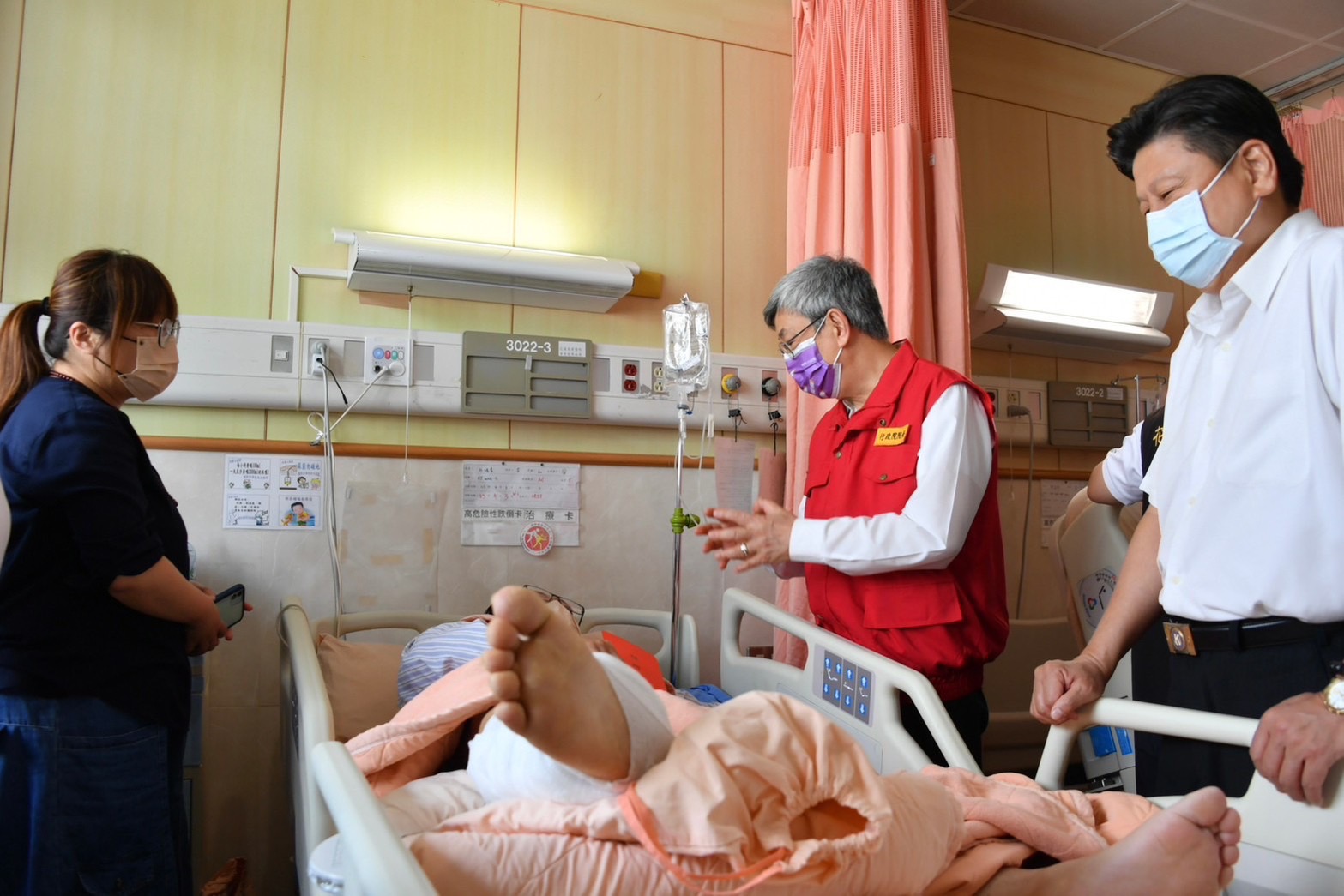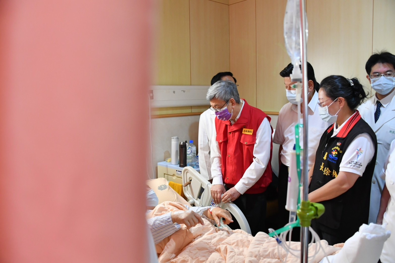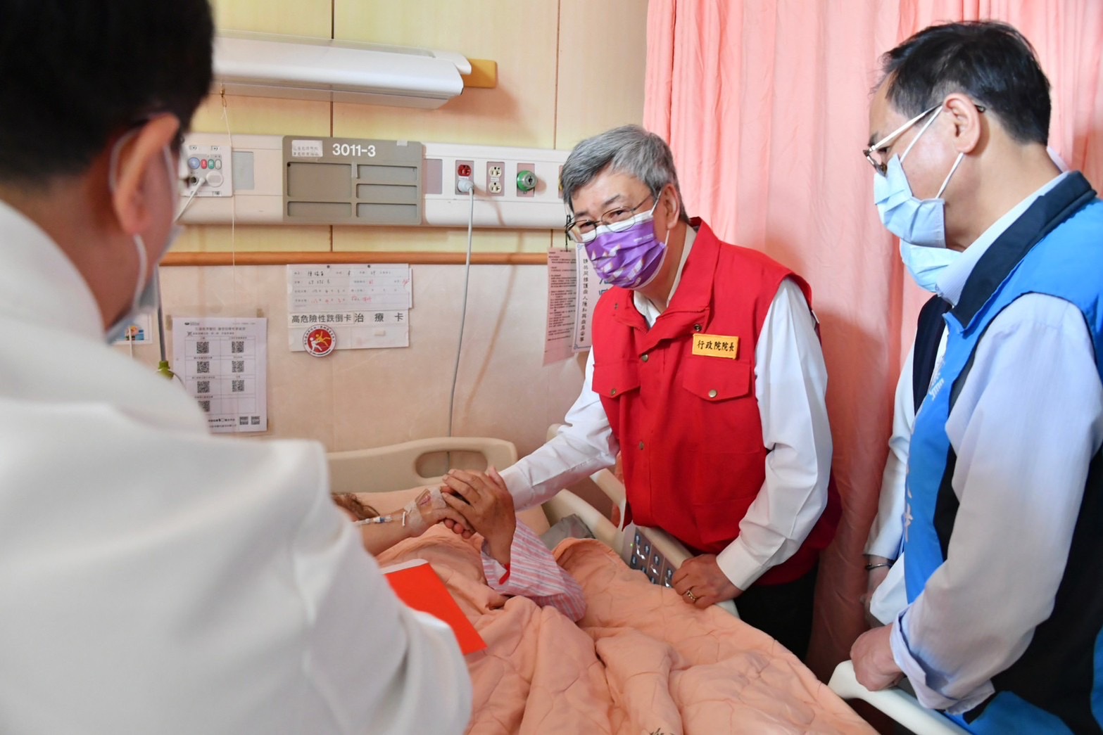 隨後,陳院長在徐榛蔚縣長等人陪同下前往花蓮慈濟醫院慰問受傷民眾,在林欣榮院長與李毅醫務秘書說明下,了解醫院收治狀況,並發放慰問金祝福傷者早日康復。接續,陳院長前往中華國小關心受災民眾收容安置情形,向受災安置居民加油打氣並表達慰問之意。陳院長也特別感謝國軍在震災第一時間投入相關救援救災工作,並快速組裝「野戰移動式沐浴機」予收容安置民眾沐浴使用。