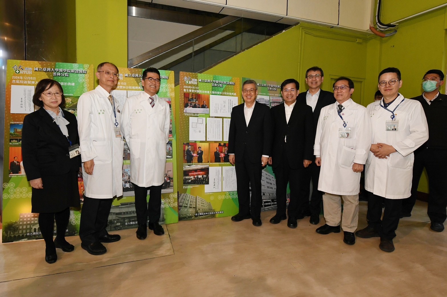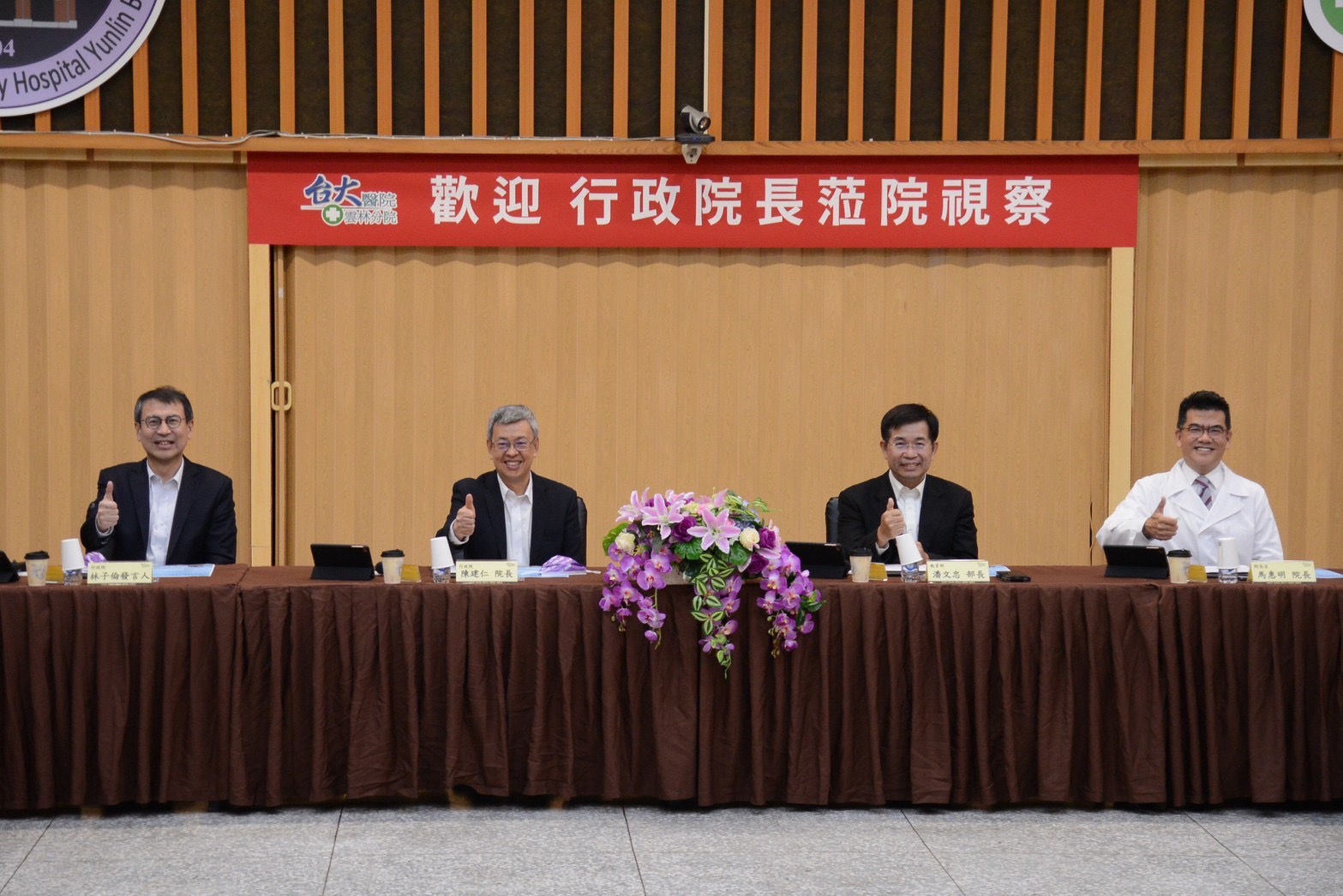 陳院長抵達後,首先在馬惠明院長的引導下,參觀院區大愛紀念牆、檔案展,並在院長擔任衛生署署長時簽署的「行政院衛生署雲林醫院移撥作為臺大醫學院附設醫院雲林分院之移撥書」檔案照片上簽名留念;隨後,院長聽取馬院長說明「臺大醫院雲林分院 安心雲林 e院聯防」簡報,了解該分院設置、營運概況及未來規劃,並於致詞結束後,與行政院林子倫發言人、教育部潘文忠部長、馬惠明院長等人,現地視察眼科智慧醫療車、手持眼底鏡、眼壓計、電腦驗光機、無線數位聽診器、傷口照護機及遠距照護包等遠距醫療設備,並觀看雲林分院醫師與彰化基督教醫院連線示範遠距醫療操作情形;最後,院長也與醫療團隊合影留念。