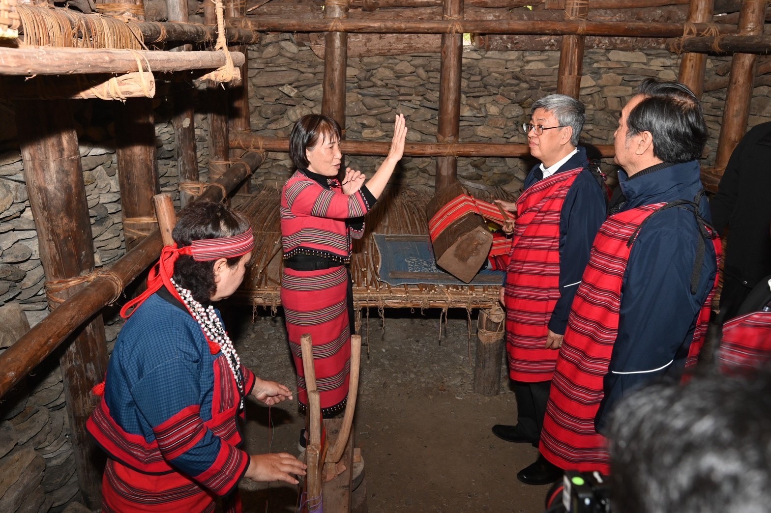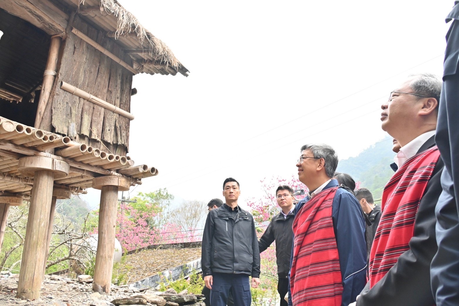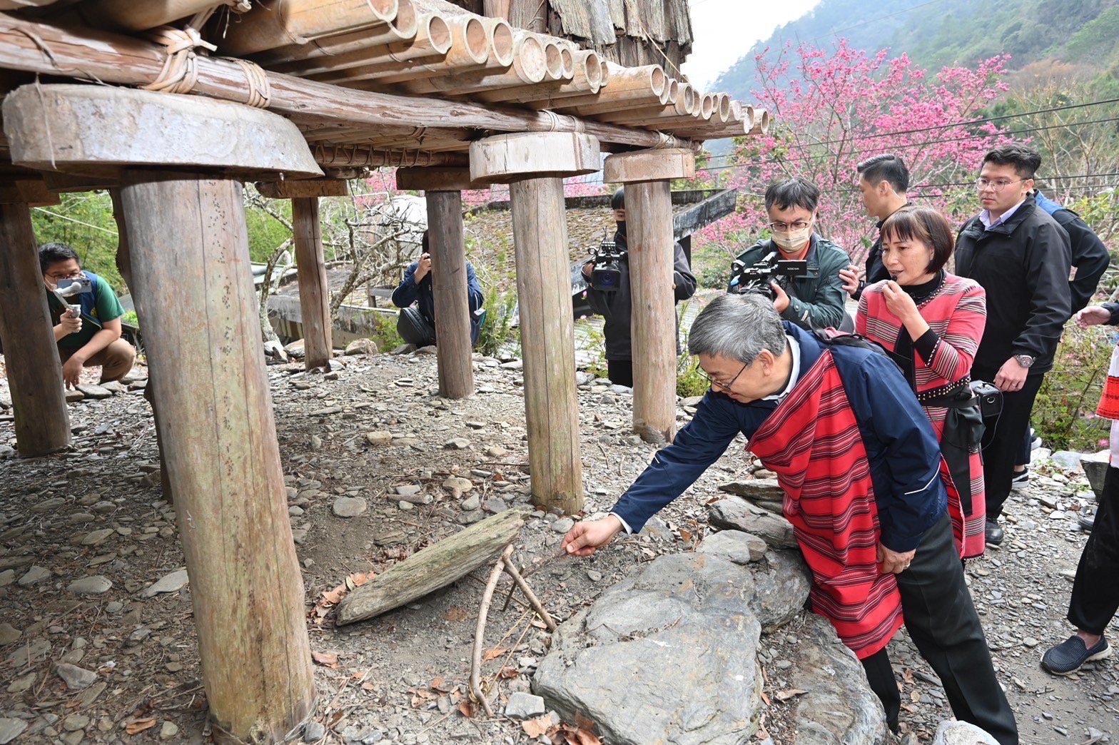 陳院長蒞臨現場後,由江嬌媚女士協助他穿上當地賽德克族傳統服飾,再由王萬全耆老以母語向祖靈報告,為現場所有貴賓祈福;隨後,陳院長也親自栽種苦茶樹苗,以行動支持當地產業,並在盛開的櫻花樹下大合照;陳院長接著聆聽陳巨凱及吳宗澤先生分別解說青年培力工作站「順騎自然有限公司」與「穀笠合作社」地方創生成果展示,以及王孝良先生簡報部落「推動原鄉苦茶生態系統」。致詞結束後,陳院長在江嬌媚女士導覽解說下,也參觀原夢觀光農園園區及賽德克家屋,了解家屋構造、機能。