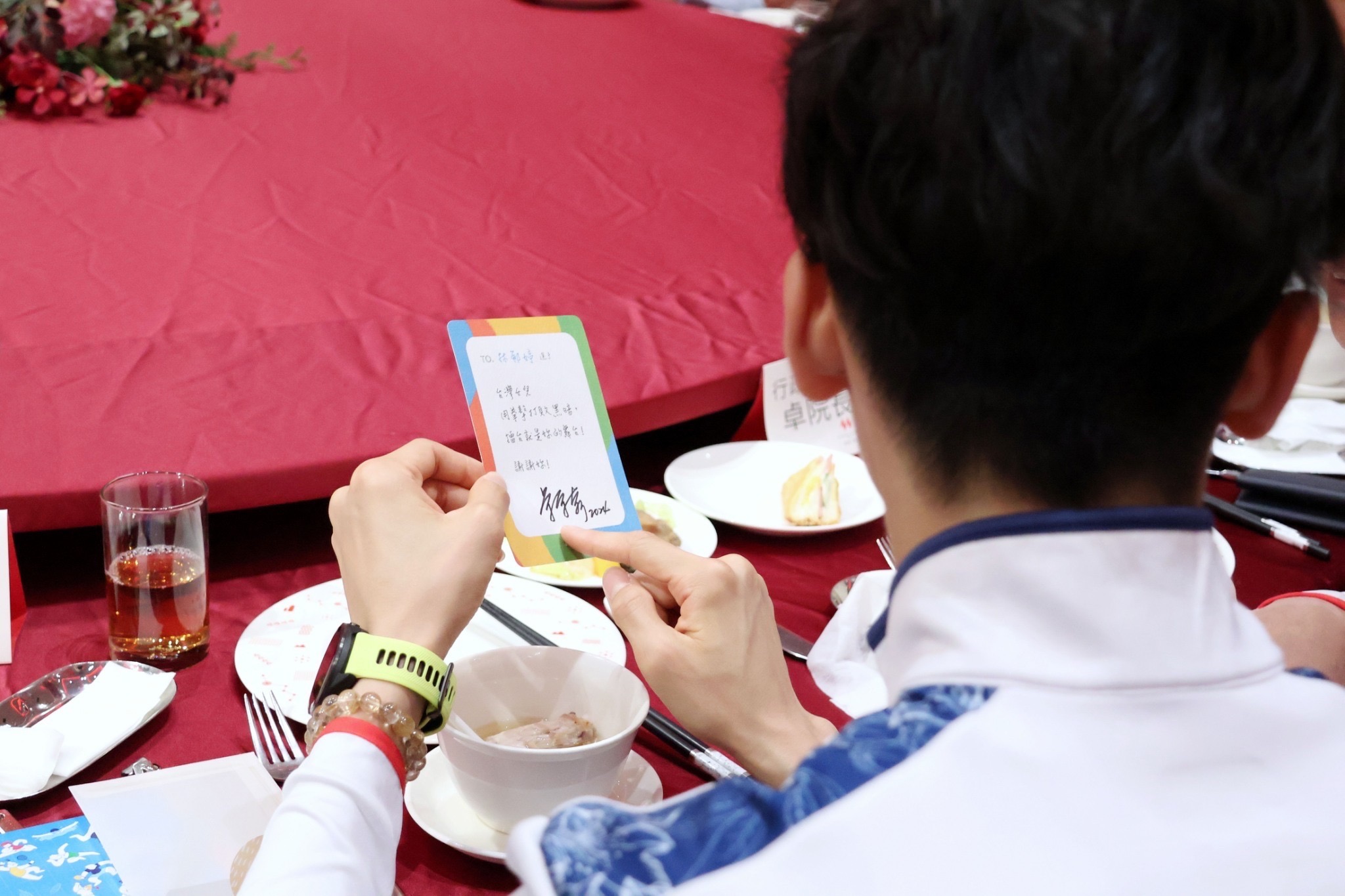 此行,卓院長入座後,首先和與會貴賓一同欣賞奧運競賽成果影片,並聽取張煥禎總領隊分享參賽成果及選手優異表現。致詞結束後,我國代表團由男子單槓銅牌選手唐嘉鴻、拳擊女子60公斤級銅牌選手吳詩儀、男子定向飛靶銅牌選手李孟遠及女子拳擊66公斤級銅牌選手陳念琴,分別致贈院長奧運吉祥物及簽名會旗;院長也回贈代表團選手每人一只手錶,由拳擊女子57公斤級金牌選手林郁婷代表受贈。