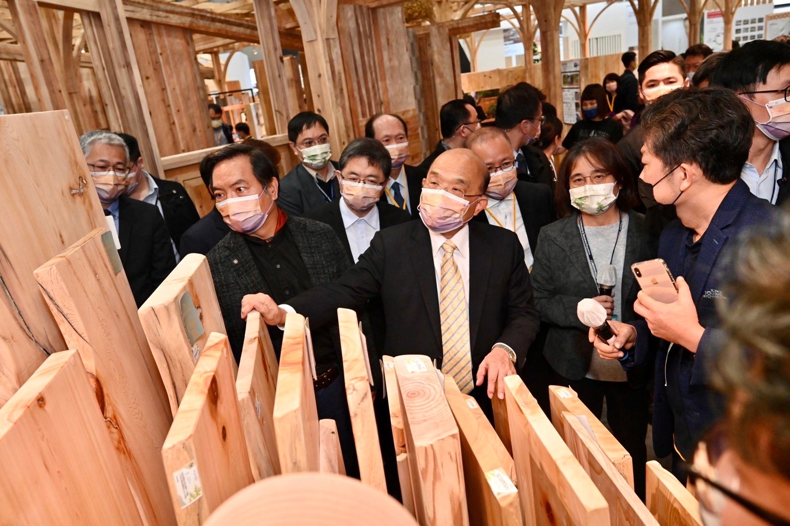 接著,蘇院長前往「國產材台灣館」聯合展區參觀,由農委會林務局副局長林澔貞及臺大實驗林主任莊閔傑介紹臺灣履歷驗證木材與臺灣竹產業發展現況。蘇院長參觀時也詢問廠商有關臺灣木材在應用上的設計與開發現況,並細聞現場展示木桌、木片的木香味;隨後,蘇院長在參觀臺灣竹產品區時,也試坐竹製葫蘆椅凳、曲木加工竹椅,還脫下外套嘗試舊式剖竹子的方式,廠商強調現在剖竹都已用機器處理,感謝政府今(2022)年開始補助國內竹產業相關所需機具。蘇院長也與吳澤成政委一同坐在埔里原竹搭建的遊憩椅上合影,並與吳政委討論臺灣竹產業的開發與推廣,希望將臺灣優良竹子融入民眾日常生活中。