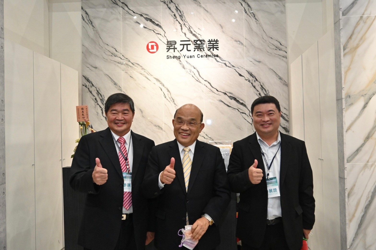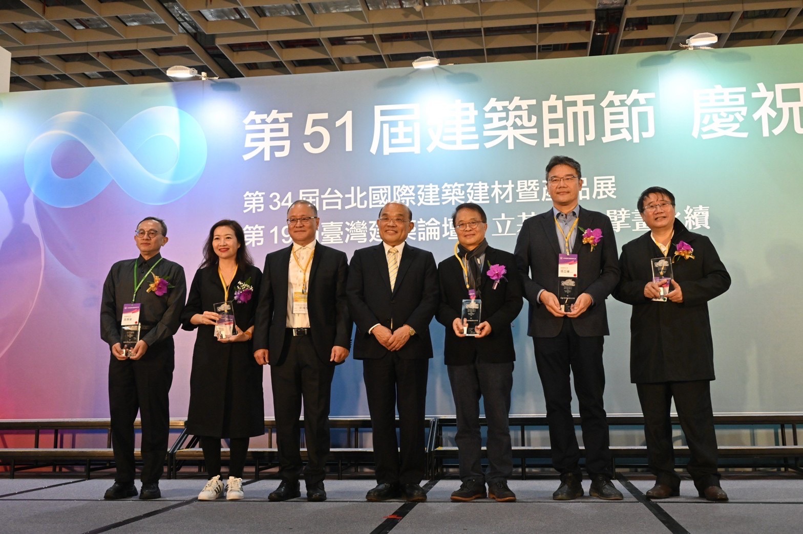致詞結束後,蘇院長頒發臺灣建築獎及臺灣建築佳作獎,並與建築師公會成員合影留念,接著步行至南港展覽館4樓展館參觀台北國際建築建材暨產品展。蘇院長首先參觀美國館,由美國在台協會(AIT)傅文燕女士介紹美國木材特性及建築推廣現況,隨後參觀昇元窯業,由該公司副總林元祥解說窯燒的先進工法及介紹現場展示新興磁磚花色樣品。