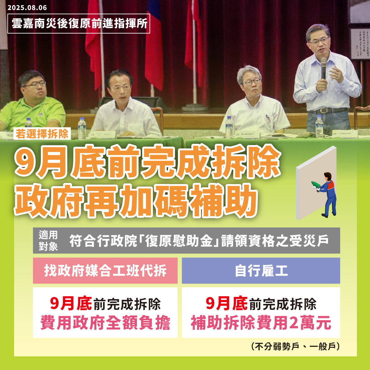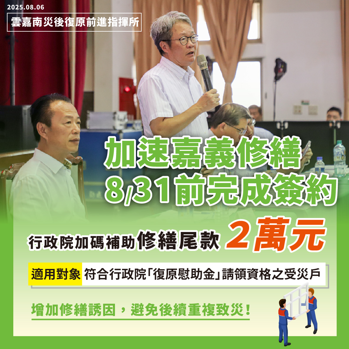 為提高修繕能量並保障工程進度,政府也提供「上工津貼補助」,針對進場協助修繕的廠商,依損壞面積發給1.5萬至3萬元不等的津貼;已完成修繕的業者,如可提出佐證資料,也可追溯申請。此外,災民若於8月17日前與媒合廠商完成簽約,政府將加碼2萬元獎勵金;若選擇拆除不再重建者,委由政府媒合並於9月底前完成拆除,拆除費用由政府全額負擔;自行雇工者則補助2萬元。