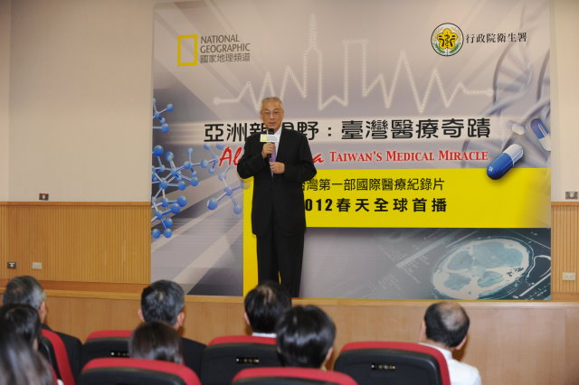 行政院長吳敦義今(22)日出席以台灣醫療服務國際化為主題的紀錄片「亞洲新視野:台灣醫療奇蹟」記者會時表示,國家地理頻道是全球最受歡迎的好頻道之ㄧ,感謝該頻道將於明年春天播出這部影片,不僅讓國人同感興奮,也讓全世界欣賞到台灣在政治民主的成熟、經濟的發展與教育普及之外,更看到台灣的醫療奇蹟。