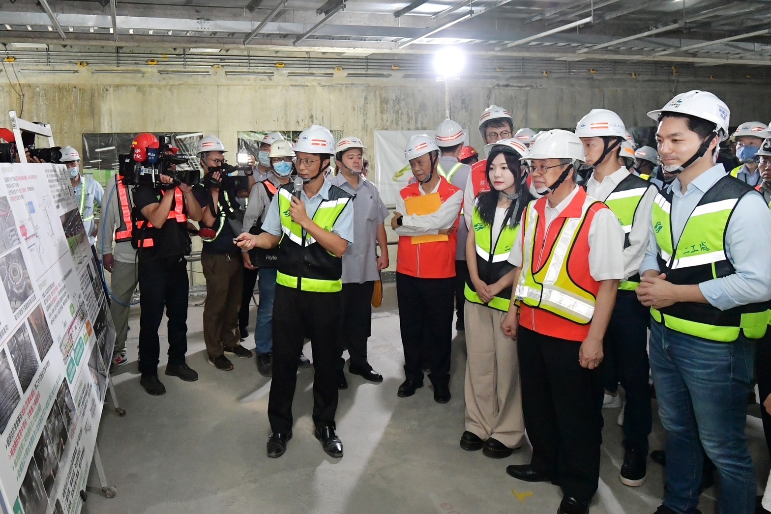 此行,陳院長入座後,手持「順利完工」標語手板,與行政院李孟諺秘書長、林子倫發言人、交通部胡湘麟次長及臺北市蔣萬安市長等貴賓一同合影,並聽取捷運局第二工程處劉安德處長簡報「臺北都會區大眾捷運系統萬大-中和-樹林線(臺北端)工程」。致詞結束後,蔣市長特別致贈院長「潛盾機切刃盤磨損切刃刀片」留念。隨後,院長在劉處長陪同解說下,現地視察環控機房(B2層)至車站月臺(B3層),瞭解工程施作概況。