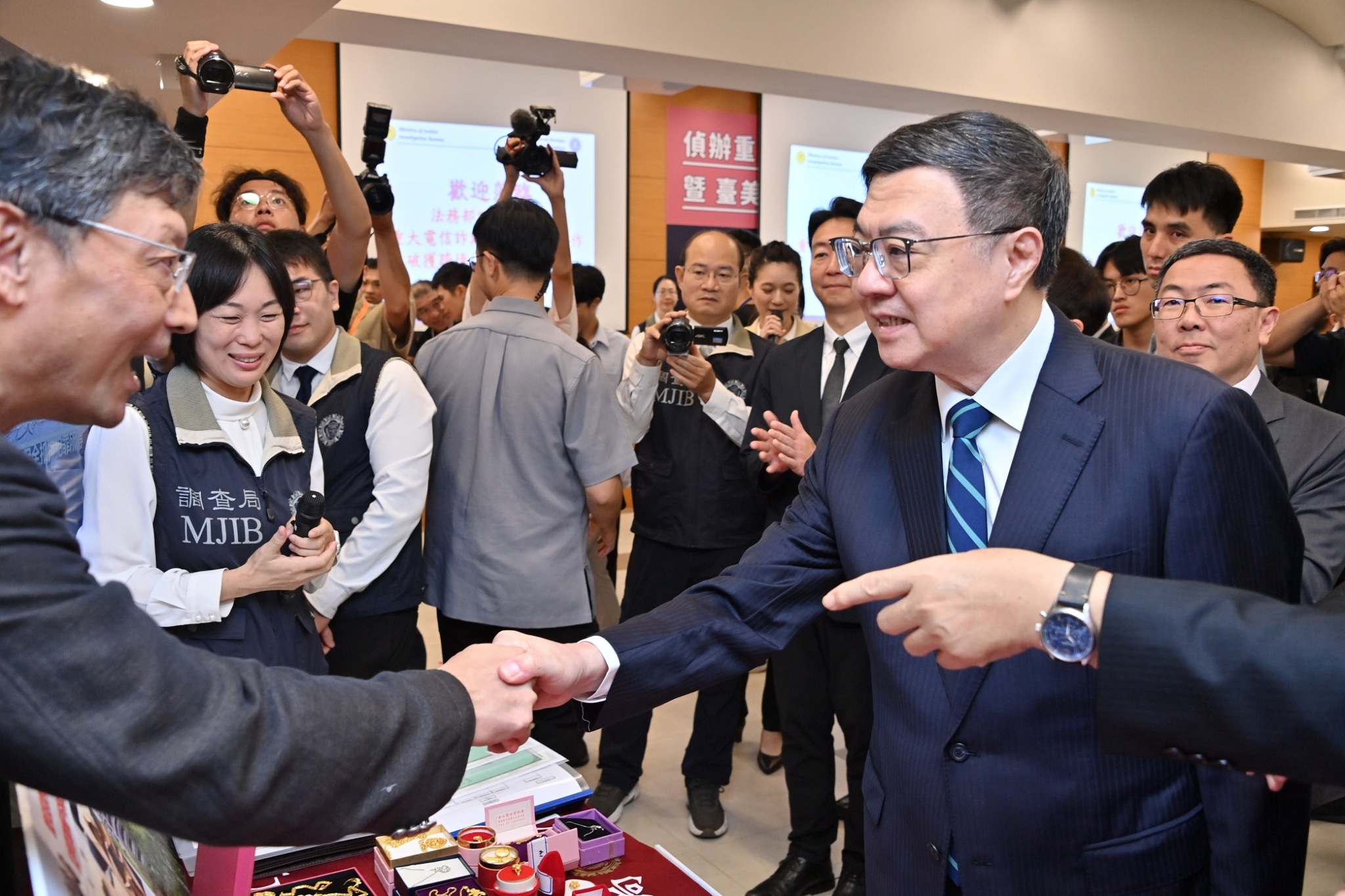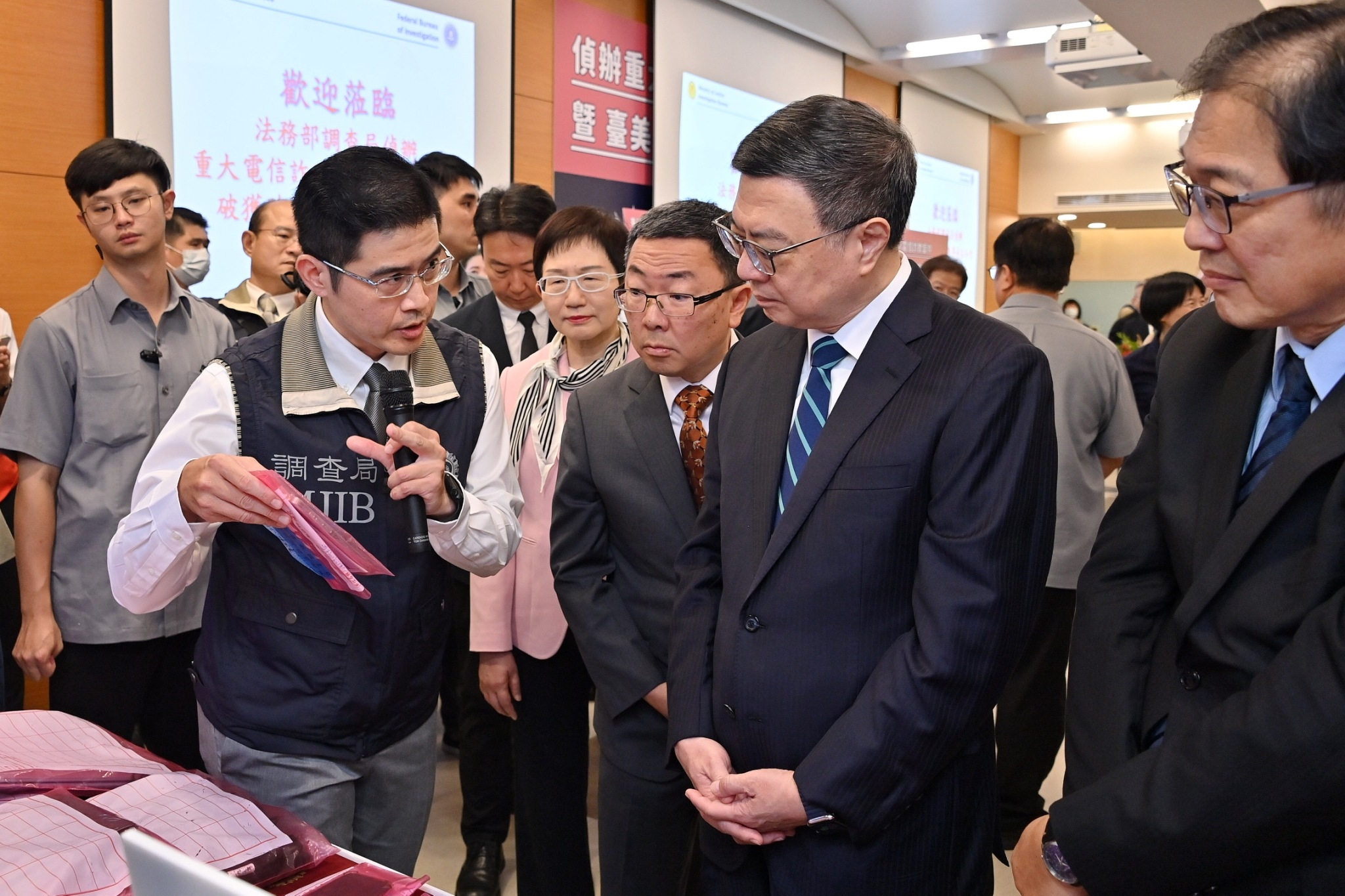 致詞結束後,卓院長與行政院林明昕政務委員、陳世凱發言人、法務部鄭銘謙部長、財政部莊翠雲部長、最高檢察署邢泰釗檢察總長、高等檢察署張斗輝檢察長、法務部調查局陳白立局長、吳以公副局長、何復生處長、財政部關務署彭英偉署長、美國聯邦調查局Ty Cook組長及Bill Baoerjin聯絡官合影,接續再分別與本次查緝各類詐欺案有功人員合影留念,為投身於打詐工作的同仁們加油打氣。