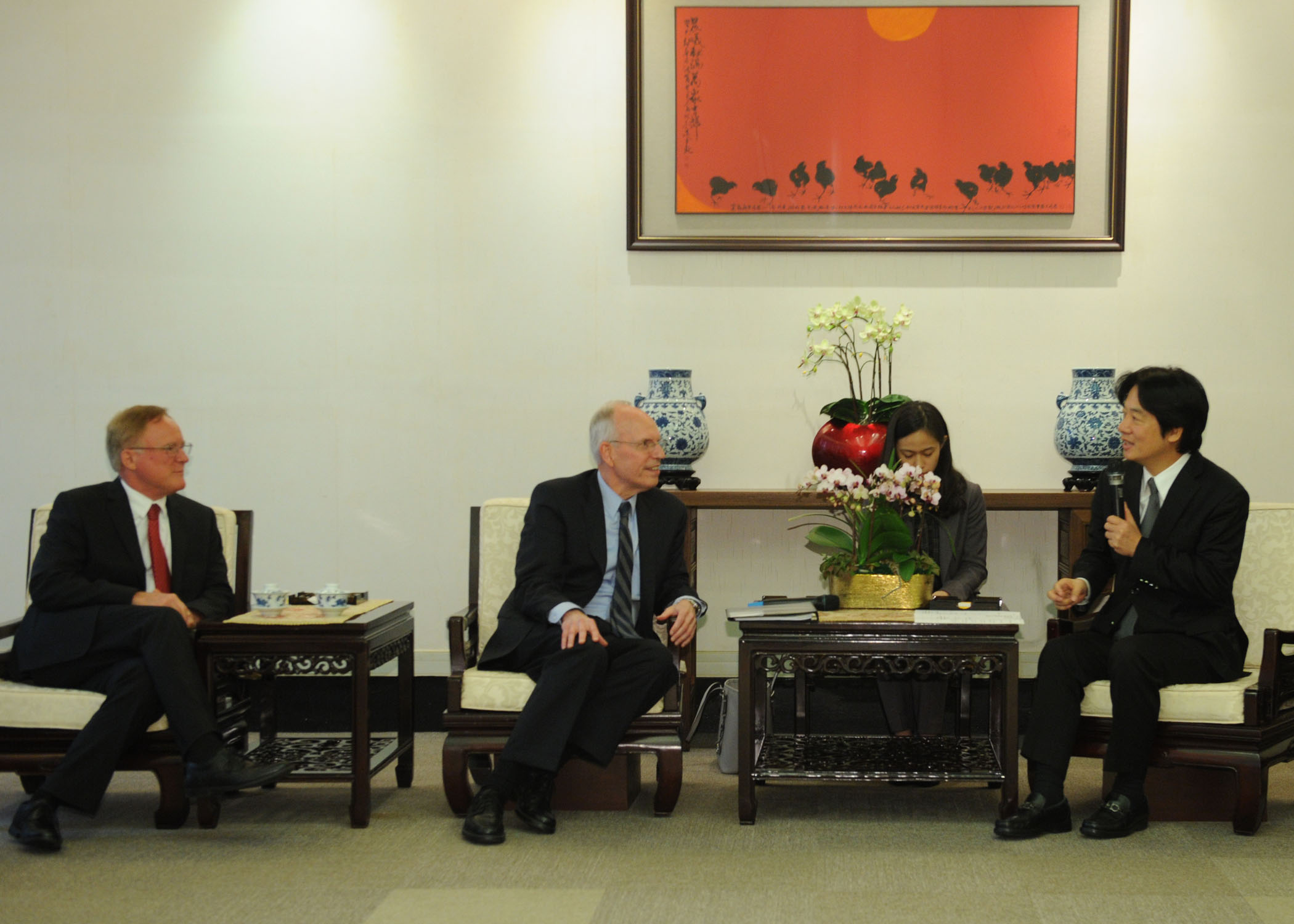 賴院長表示,台灣近幾年不論在政治穩定、經濟發展、民主自由或社會制度方面皆得到美方協助。美國的「台灣關係法」長年來給台灣強而有力的保證,國務卿提勒森也在參議院作證時,重提對台六項保證,這對穩定台灣民心幫助很大。對此要代表行政院向美國政府表達感謝。