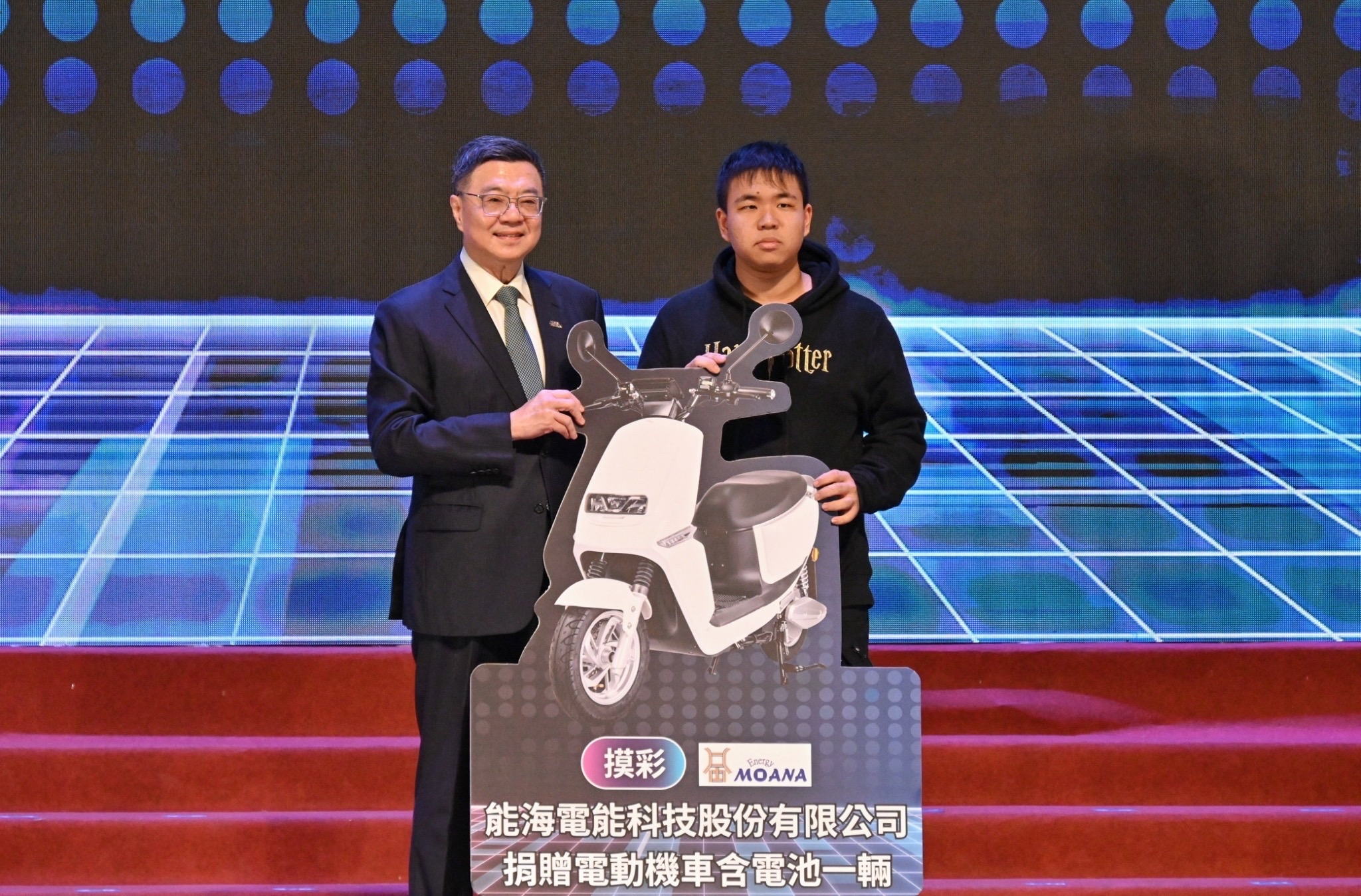 接續,卓院長以觸碰平板方式,為本屆技藝競賽頒獎典禮抽出頭獎「電動機車」幸運得主,由國立成功大學附屬臺南工業高級中等學校翁誌祥學生獲得。最後,在卓院長監交見證下,本屆全國高級中等學校學生工業類技藝競賽工作會總幹事臺中高工黃尚煜校長將錦旗移交予下一屆競賽工作會總幹事國立岡山高級農工職業學校黃銘福校長,完成會旗交接儀式。