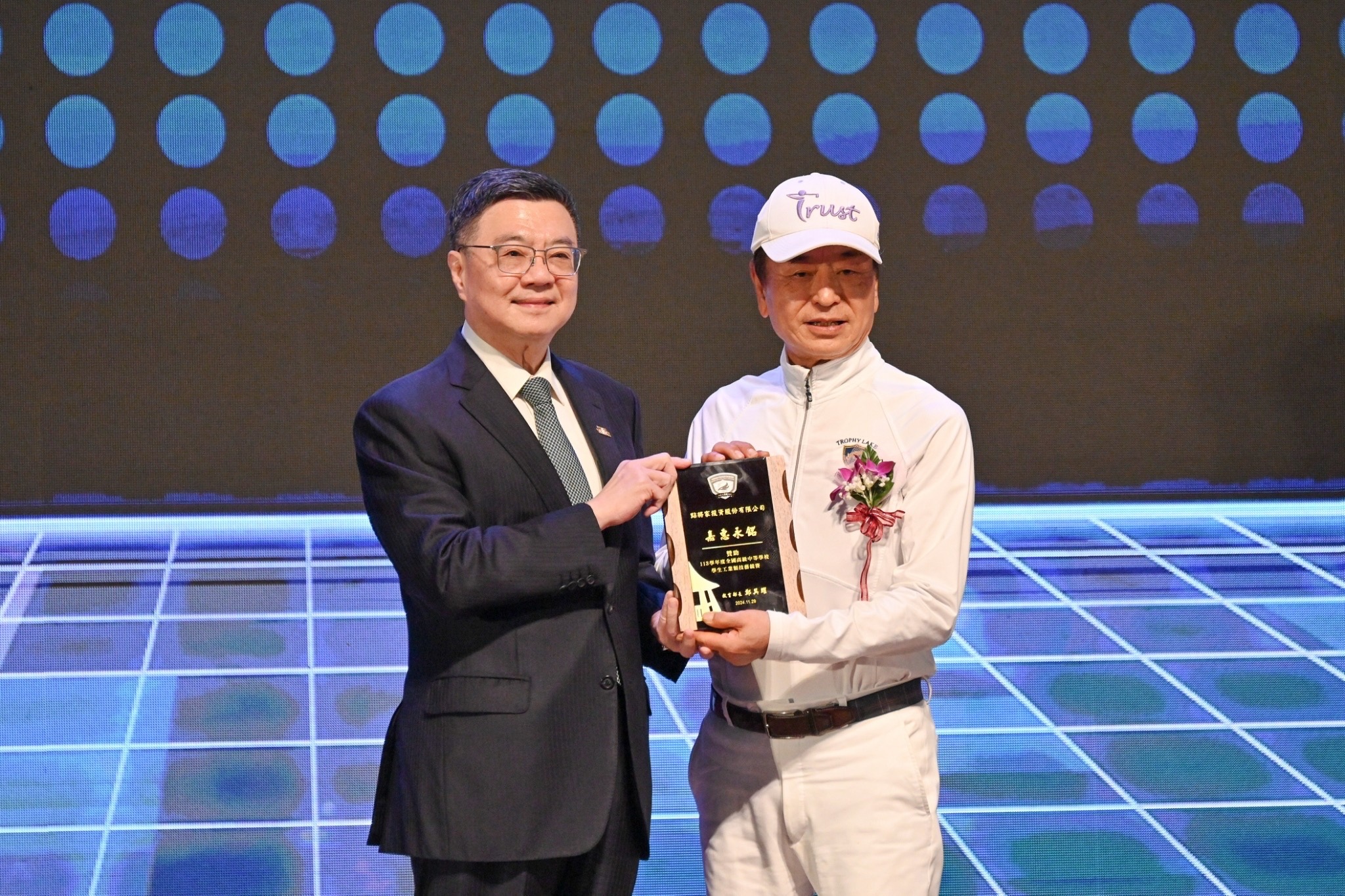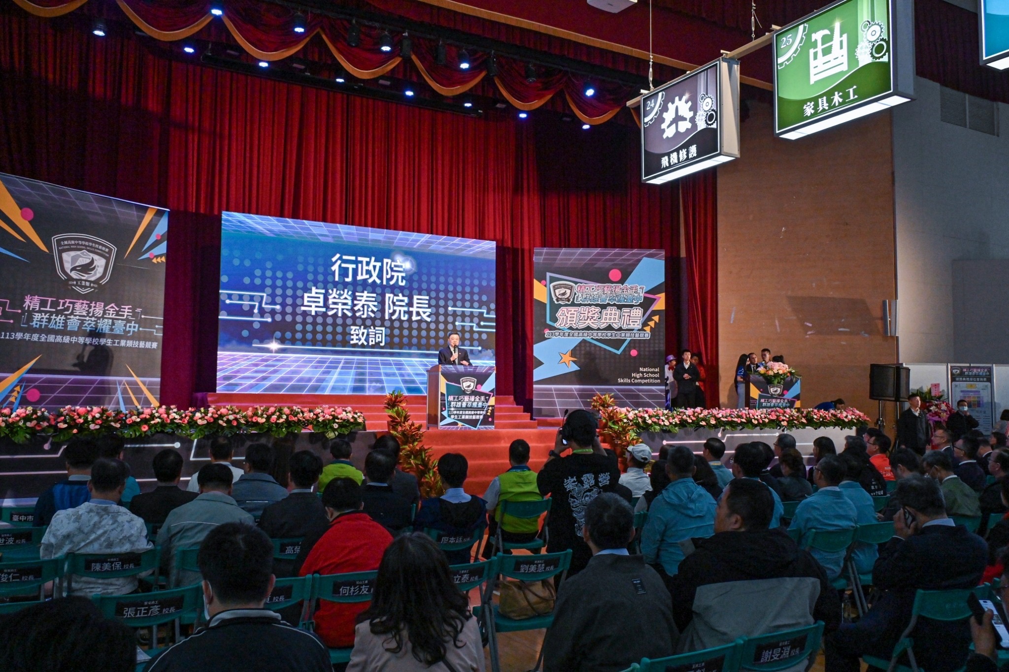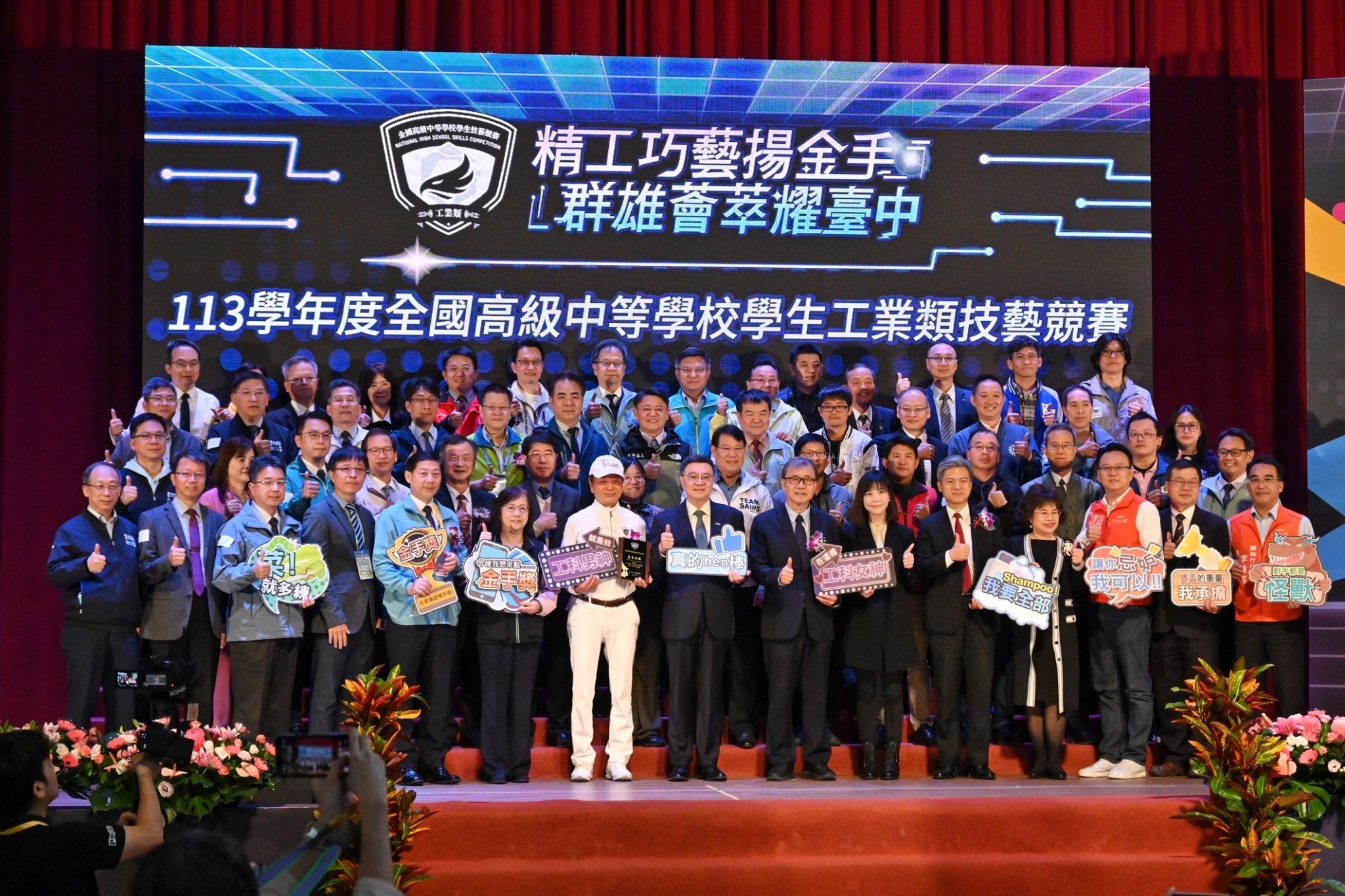 致詞結束後,卓院長首先頒發感謝狀予臺中市立臺中工業高級中等學校第1屆傑出校友陳景松董事長,表揚及肯定其長年頒發獎學金鼓勵學子投入工業類及農業類技藝競賽的貢獻;隨後,卓院長偕同行政院李慧芝發言人、教育部鄭英耀部長、教育部國民及學前教育署彭富源署長、臺中市賴淑惠副市長等貴賓與本屆承辦學校臺中高工同仁、本屆競賽得獎學校校長及代表分別持手板,合影留念,場面歡欣。