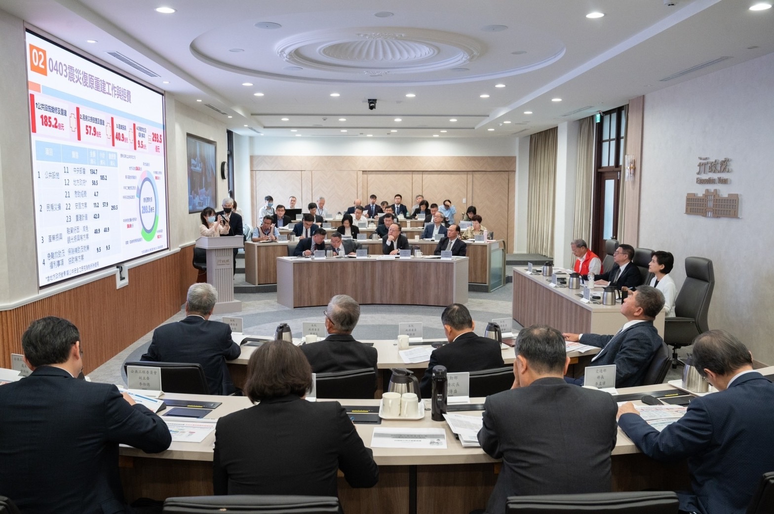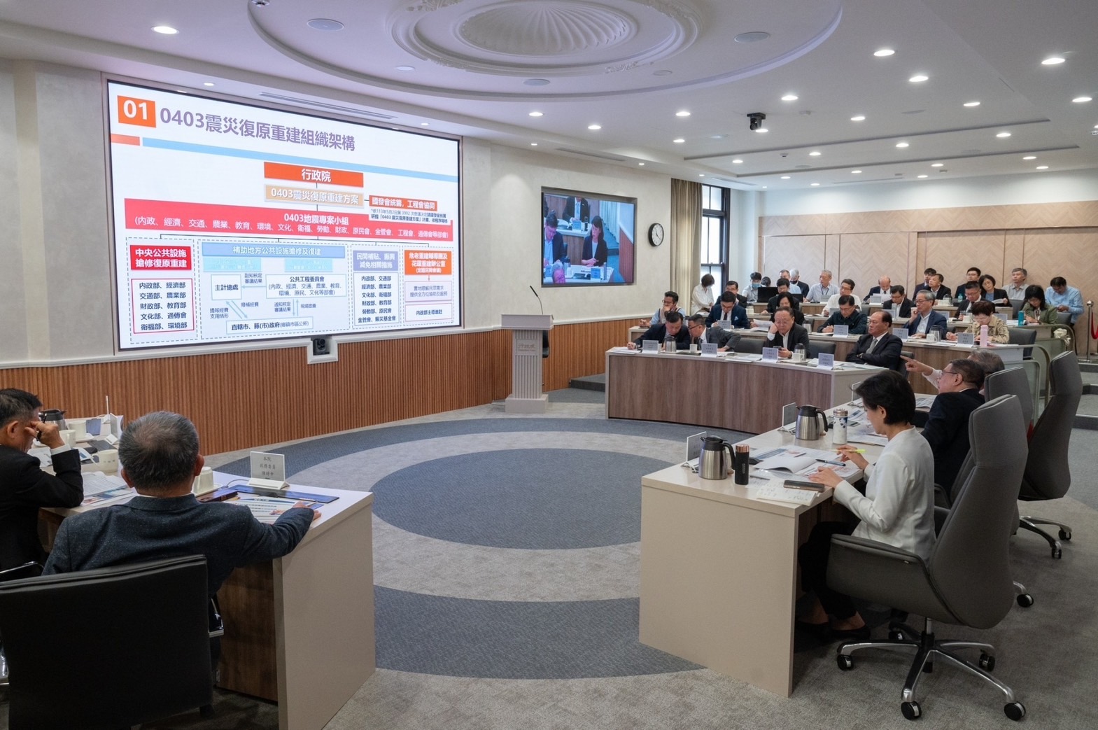 卓院長在會議中強調,本院第3902次會議中已通過之「0403 震災復原重建方案」,本方案之專案會議由當時的鄭文燦副院長主持召集,自即日起本專案會議之「0403地震專案小組」由院長擔任召集人,鄭麗君副院長督導,各項復原重建工作由工程會跨部會主責彙整,國發會專責負責其他相關計畫報院核定程序。各部會應盡心盡力依權責辦理。本方案經費來源包括公務預算、特種基金、第二預備金、特別統籌分配稅款、中央地方災害準備金及「賑災基金會專案募款」所募得的善款等,預估投入總經費需求已接近300億元,目前方案的各項專案計畫已陸續報院核定,後續各部會仍應秉持「從優、從速、從簡」三項原則,全力以赴協助花蓮及其他縣市政府,如期如質全面更有效率做好各項災後復原重建工作,並須從災民角度出發加以精進,中央地方務必嚴謹積極,凝聚力量及共識,中央要盡心盡力,地方也應發揮應有效率,合情合理,務必齊心合作,攜手努力,保障災民居住權益,重建家園及振興產業,積極展現政府無縫接軌照顧受災民衆為最高目標的行動力,成為災區民眾最大的後盾。
