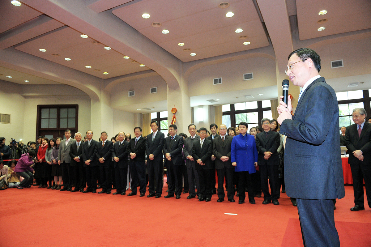 江院長表示,過去一年,臺灣接受了相當多的挑戰,行政團隊首當其衝,感謝副院長及所有同仁協助,一一克服所有困難。江院長以去年國內經濟成長率為例說明,一開始大家期待相當高,期間不斷下修,至年底確定可以保持2%左右的成長,終於讓全國民眾放心。