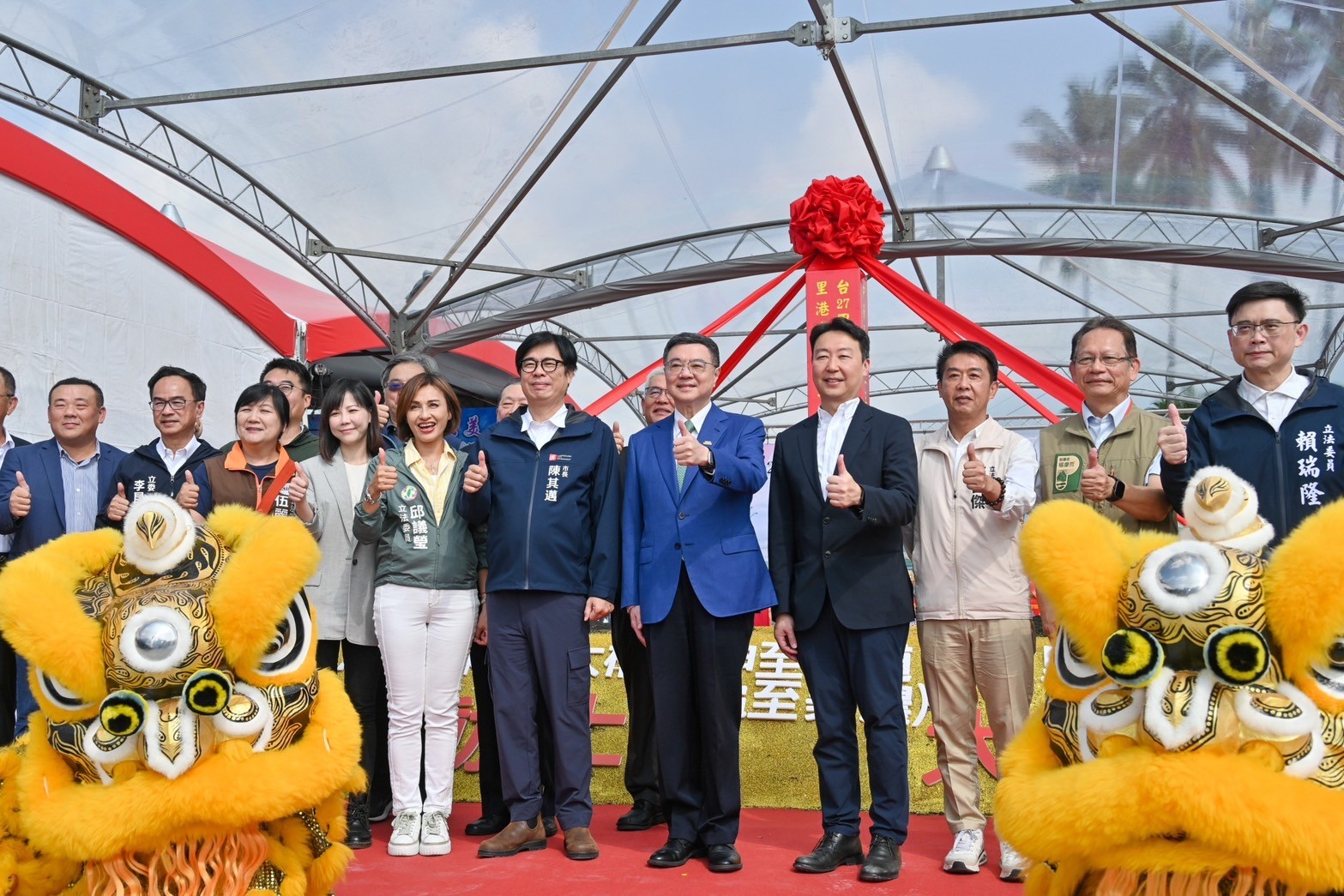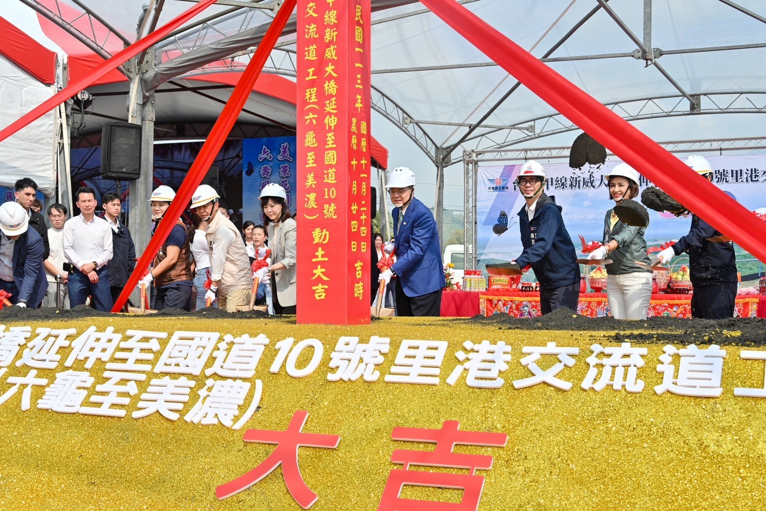 今日動土典禮在祥獅獻瑞鑼鼓聲中熱鬧開場,卓院長蒞臨會場後,首先欣賞「麒麟原住民文化藝術團」帶來的慶賀表演,接續聽取交通部公路局陳文瑞局長簡報,瞭解工程設計理念、特色、規劃及經費等。隨後,卓院長與行政院李慧芝發言人、交通部陳世凱部長、路政及道安司黄運貴司長、公路局陳文瑞局長、行政院南部聯合服務中心許乃文執行長、陳文亮副執行長、伍麗華立委、李昆澤立委、邱議瑩立委、許智傑立委、賴瑞隆立委、高雄市陳其邁市長、屏東縣政府楊慶哲秘書長、台灣世曦工程顧問股份有限公司施義芳董事長、新亞建設開發股份有限公司代表等人起鍬三鏟,完成動土儀式,並與現場貴賓們合影留念。