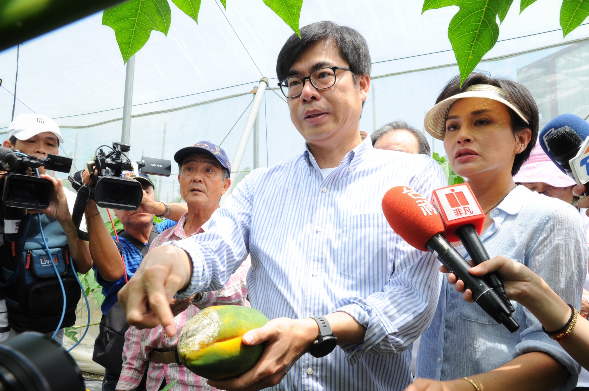 行政院副院長陳其邁今(17)日,在立法委員邱議瑩與農委會農糧署胡忠一署長陪同下,前往高雄旗山與美濃訪視農民,關心因應輕度颱風「丹娜絲」來襲前,農民所做防颱準備。他說,今天上午10點,蘇貞昌院長已經前往中央應變中心視察,聽取各部會的防颱工作簡報。他則是南下回到高雄,提醒農民做好防災準備。