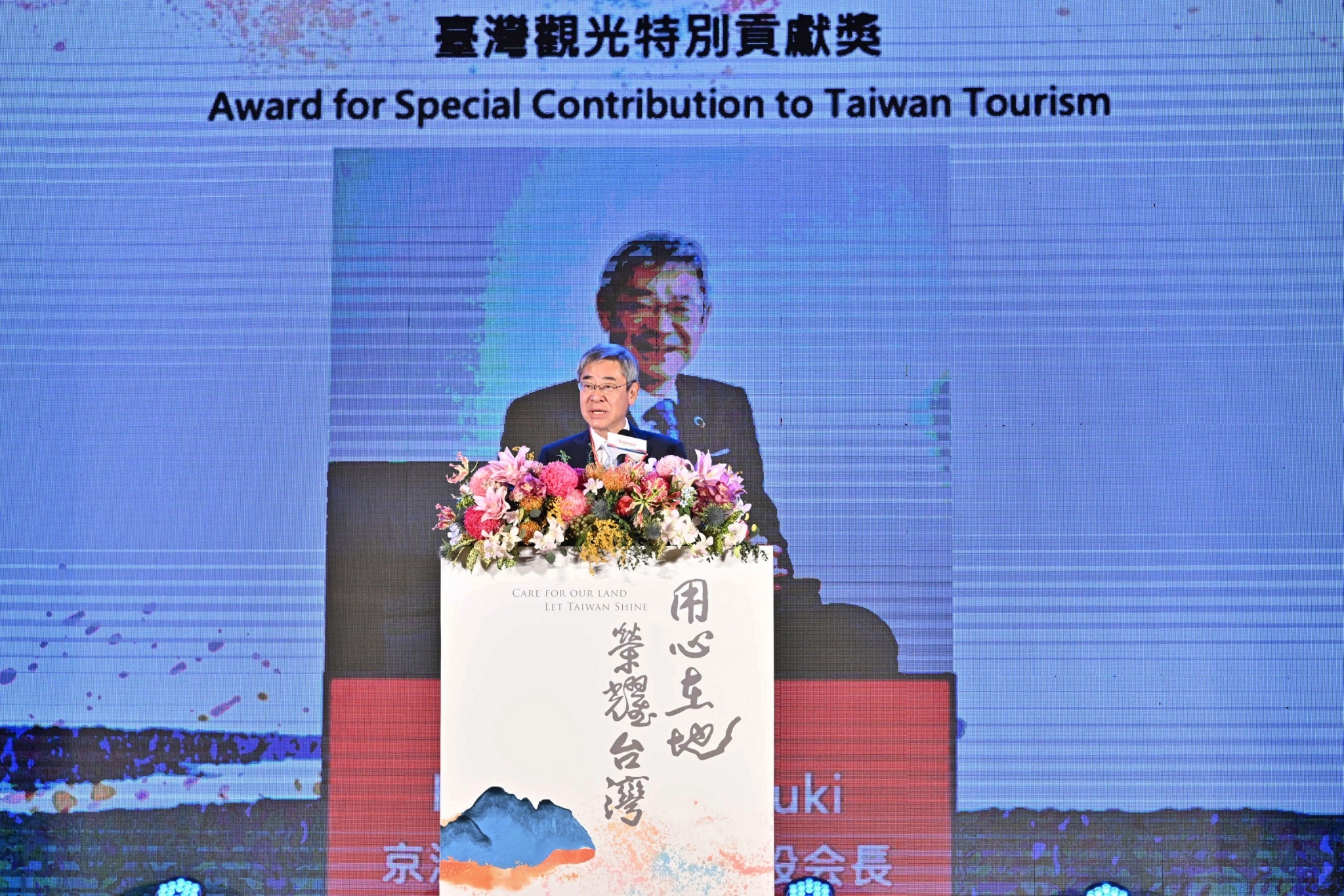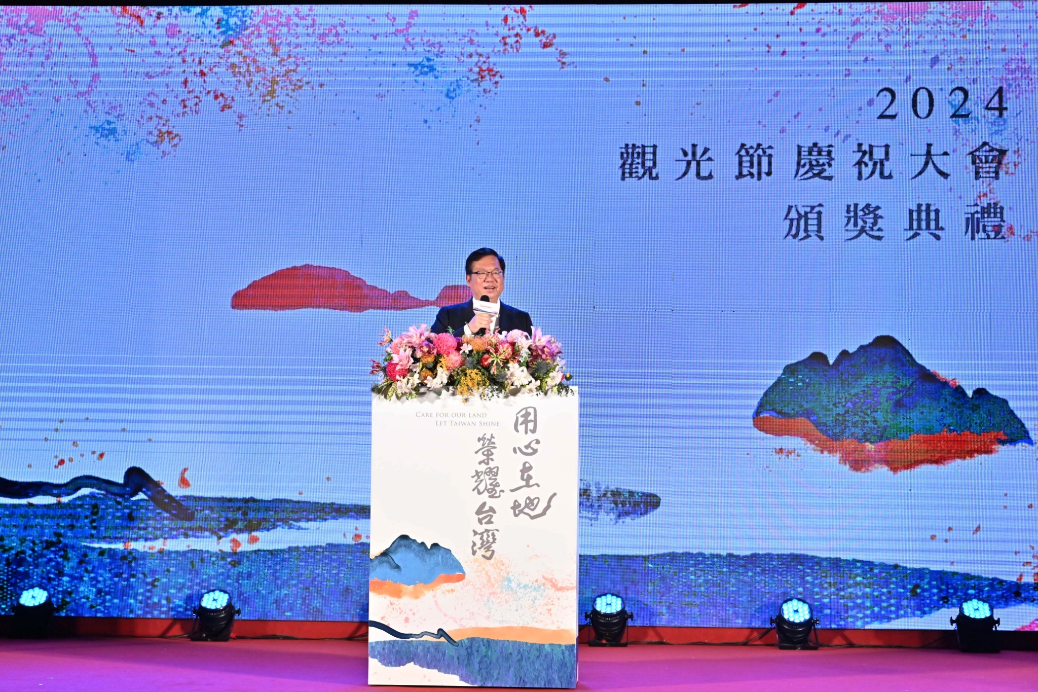 鄭副院長致詞時表示,今日很高興代表行政院出席頒獎典禮,表揚2023年表現優異的國內外觀光產業團體及個人。臺灣在去(2023)年COVID-19疫情解封後,為振興疫後觀光,交通部於疫後特別預算提出「加速擴大吸引國際觀光客方案」,提供來臺自由行旅客及團客多項獎勵措施,並推動「台灣好行」優化服務及「觀光路廊在地有腳接駁服務」等措施;同時,他每月亦親自主持「促進國際觀光客來臺跨部會專案會議」,擬定許多促進國內觀光政策,盼能拓展客源、增加觀光流量,讓更多國際友人認識臺灣、喜歡臺灣。此外,政府去年也訂定國際旅客全年600萬人次入境的目標,在大家通力合作下,最終順利達到648萬人次,進一步實現蔡英文總統所期許「打造臺灣成為一個觀光品牌,持續深化臺灣觀光旅遊品質,讓觀光成為臺灣的一張名片」的目標。