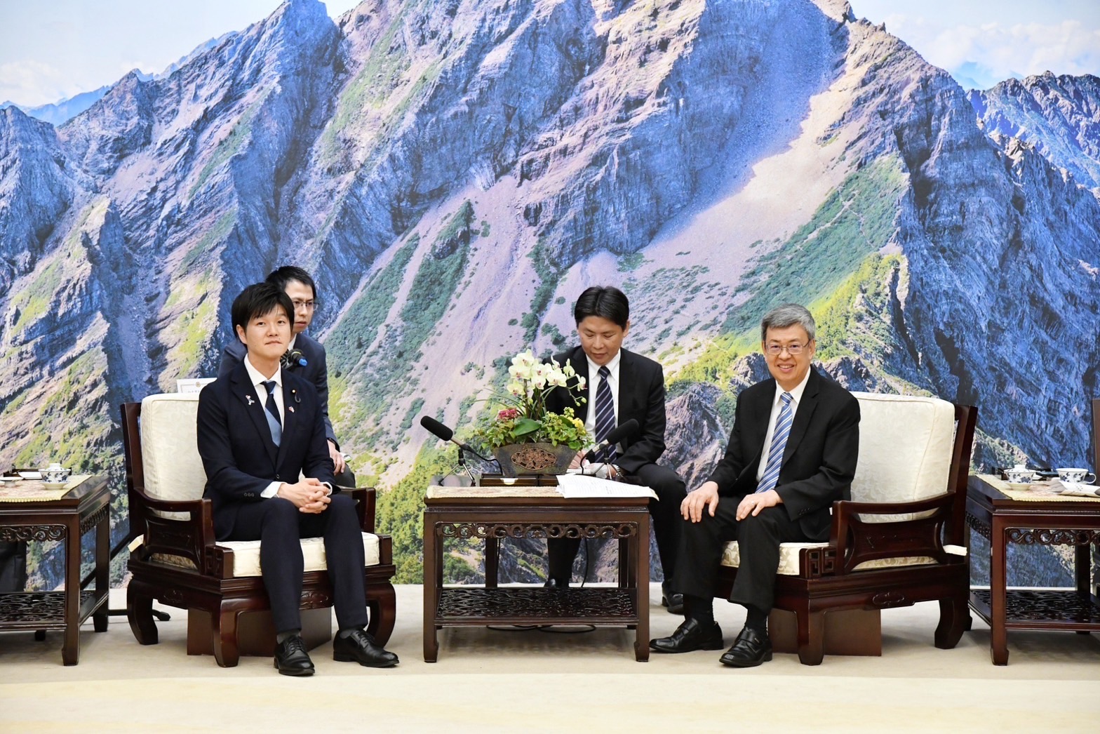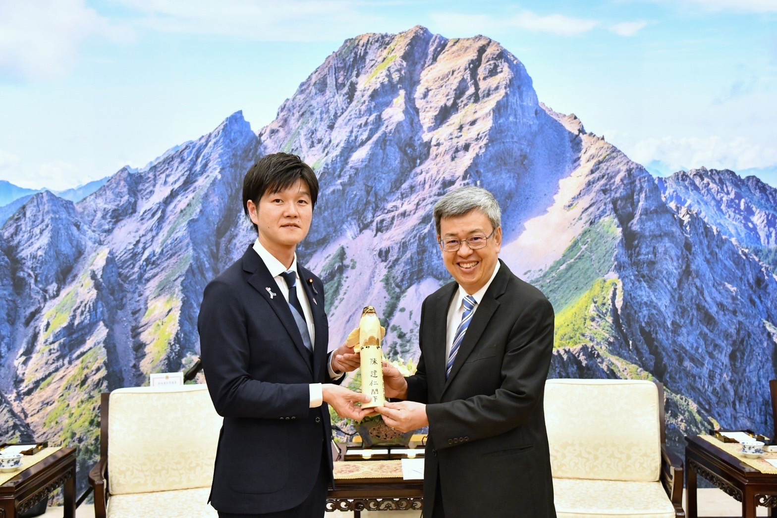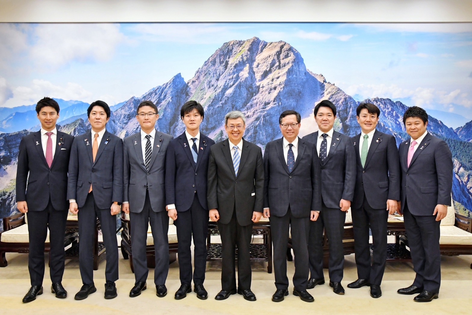 訪賓一行尚包括藤原崇眾議員、佐藤啓參議員、中曾根康隆眾議員、西野太亮眾議員、山口晋眾議員、麻生将豊會長等,由外交次長李淳陪同,前來行政院拜會陳院長,行政院副院長鄭文燦、政務委員兼代理發言人羅秉成也在座。陳院長致贈鈴木憲和眾議員「金邊轉寫盤」及其他訪賓「奉茶壺組」,雙方並合影留念。