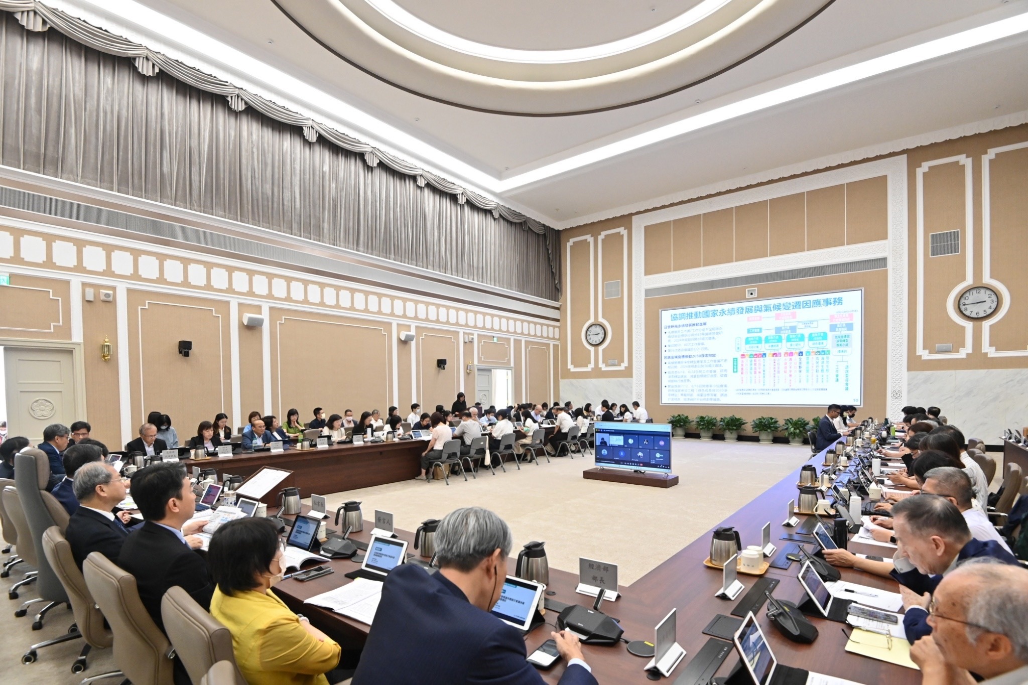 卓院長致詞時表示,今日是他上任後首次主持行政院永續會委員會議,十分榮幸能與各位委員共同為永續發展一同努力。委員們皆是來自社會、經濟、環境等領域的專家,期盼大家發揮集體智慧,以積極行動、創新思維,為臺灣「顧永續」,讓國家持續向前邁進。