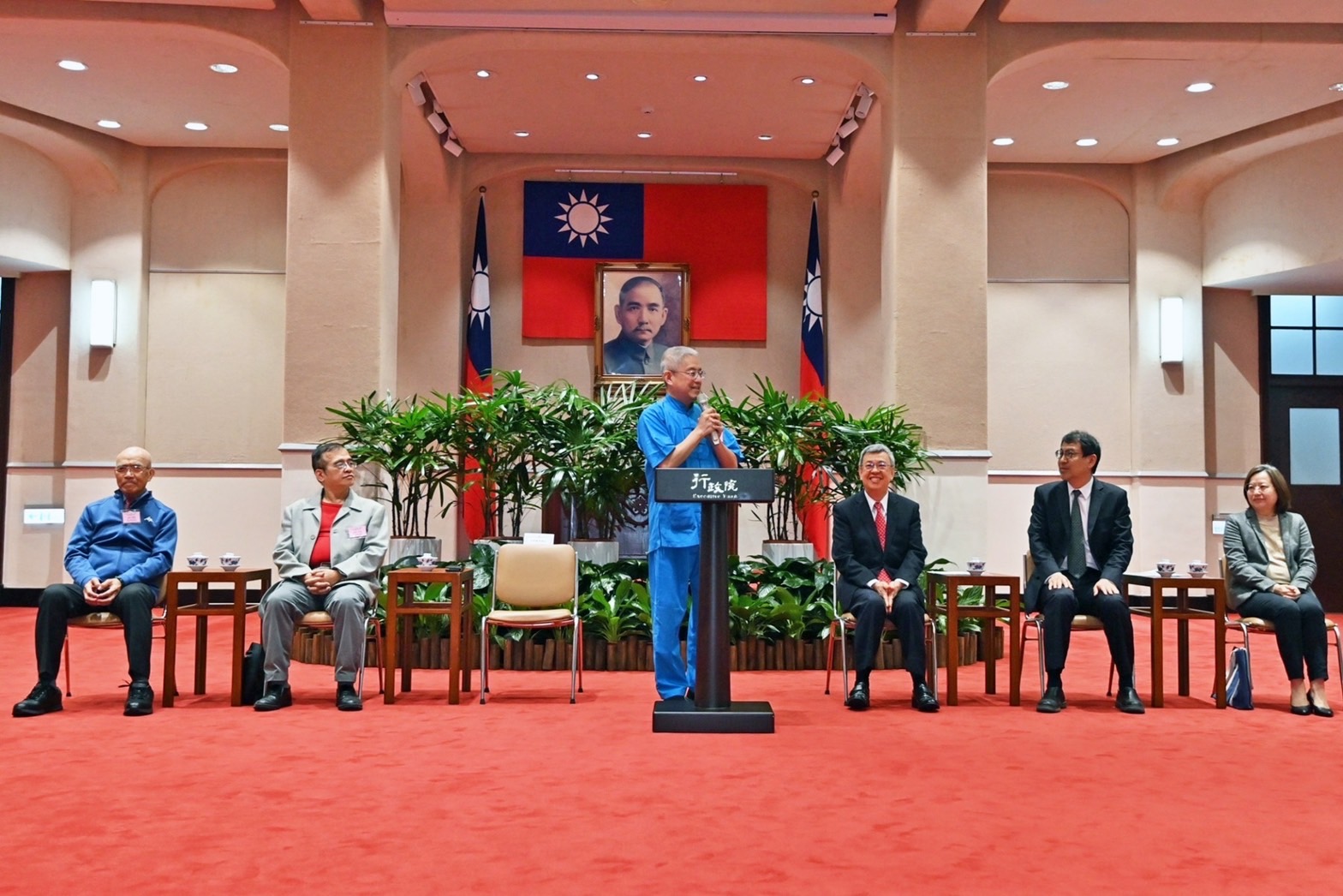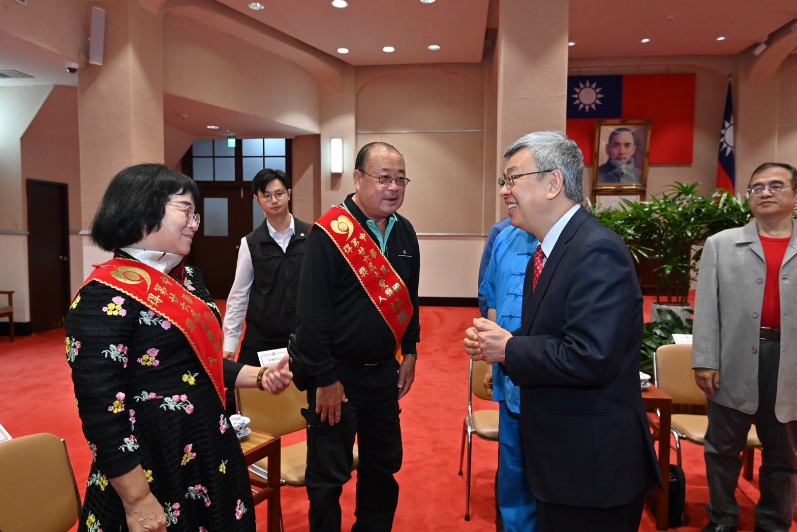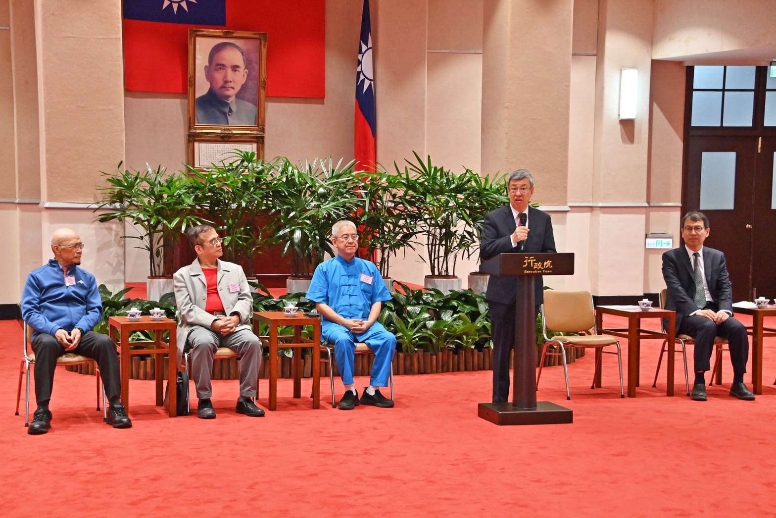 訪賓一行尚包括中華慈光愛心會李次高副理事長、陳清堂副理事長,以及林振亨先生、張錦雲女士、鄭美英女士、林順隆先生、鄭晏兒女士、黃李美慧女士、江月娥女士、邱創能先生、呂熙莉女士、林靜婕女士、吳麗璧女士、吳玉春女士、林秀美女士等11組得獎人及其家屬等人,由衛生福利部李麗芬次長、社會及家庭署簡慧娟署長陪同,前來行政院拜會陳院長,行政院林子倫發言人也在座。院長致詞結束後,也逐一與11組得獎人及其家屬合影留念,場面溫馨。