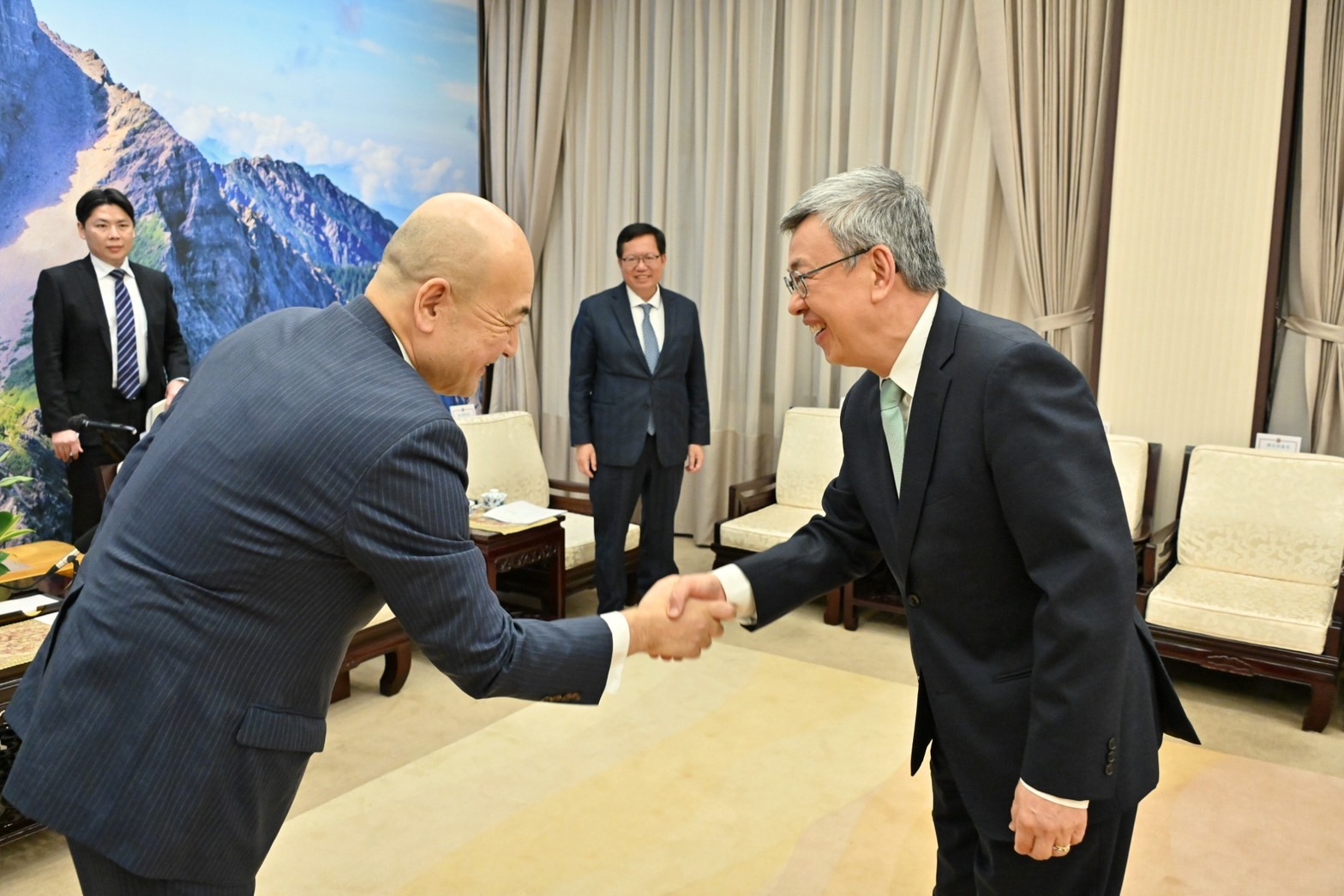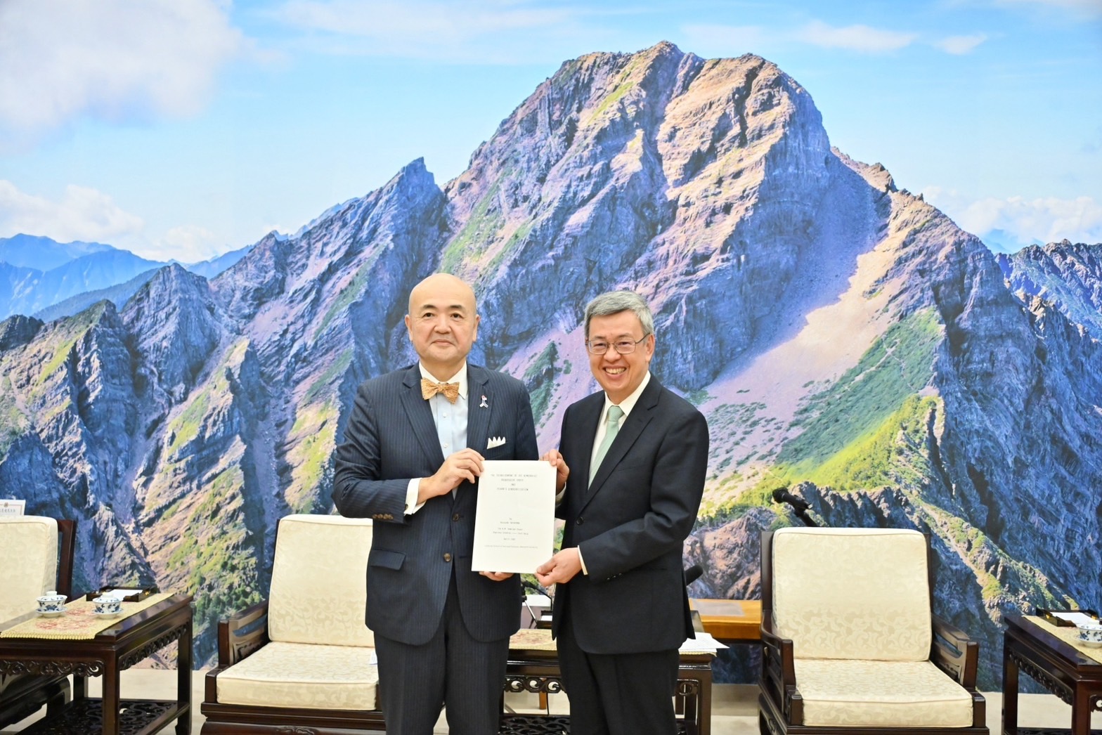 在經貿關係方面,陳院長表示,臺日互為重要貿易夥伴,去年雙邊貿易總額達882億美元,創歷史新高;近年台積電前往九州地區投資設廠,更加深化雙邊經貿及科技合作關係。院長強調,臺灣在全球貿易及產業鏈扮演相當重要的角色,不僅與美國、日本、澳洲等國透過「全球合作暨訓練架構」(GCTF),共同致力解決國際多樣課題外,更積極爭取加入CPTPP。院長說,片山代表曾任日本駐秘魯大使,日本及秘魯皆為CPTPP重要成員國,至盼片山代表能全力支持與協助臺灣加入CPTPP,並提供相關資訊與建議,相信臺灣加入CPTPP後,定能有助各國建立更強韌的供應鏈。