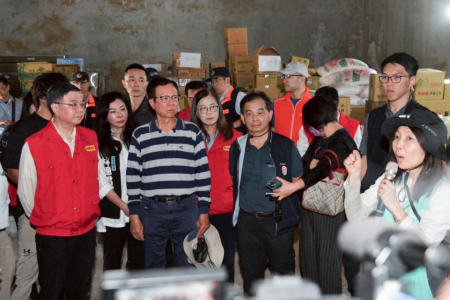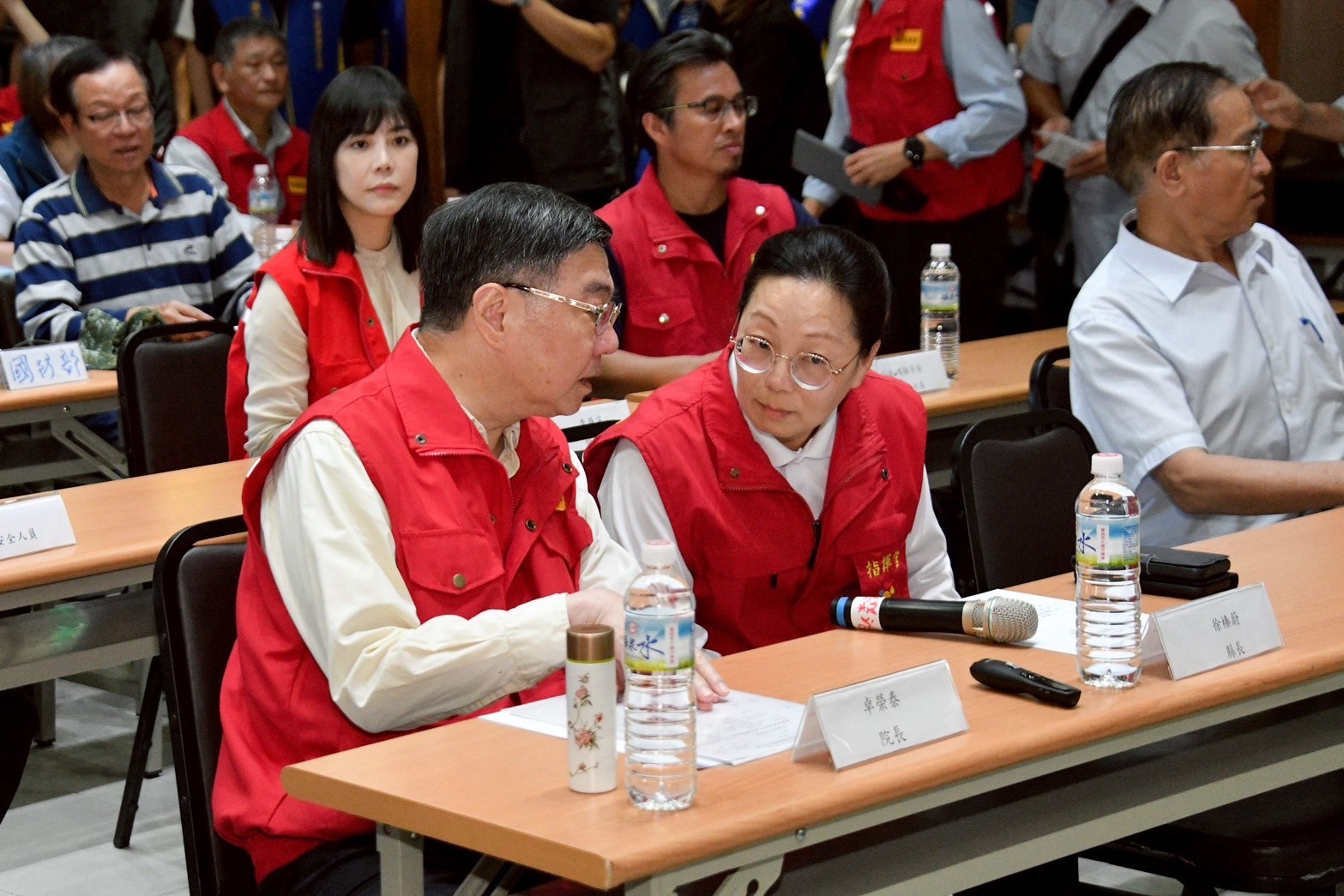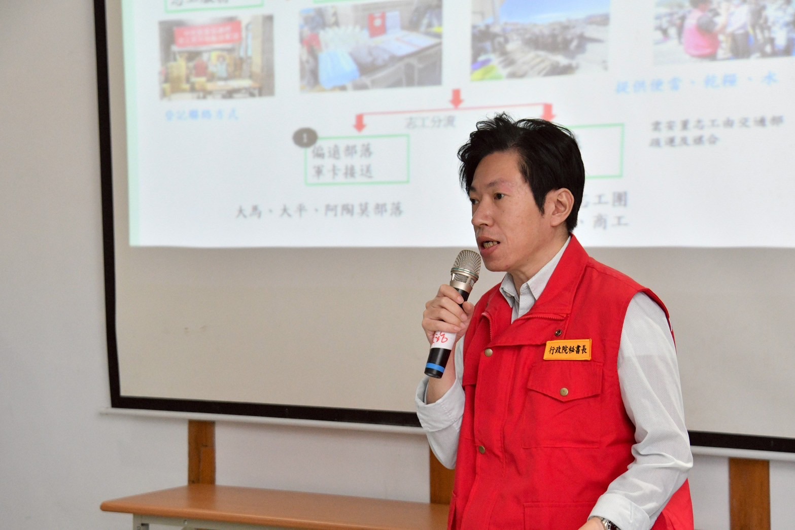 致詞結束後,卓院長特別慰問各縣市前來前進協調所支援救災的警消、國軍及海巡同仁們,並叮囑大家工作之餘也要把握時間吃飯休息;隨後,卓院長也關心物資集結處所各項救援物資配送情形,並向載送物資的司機大哥致謝。