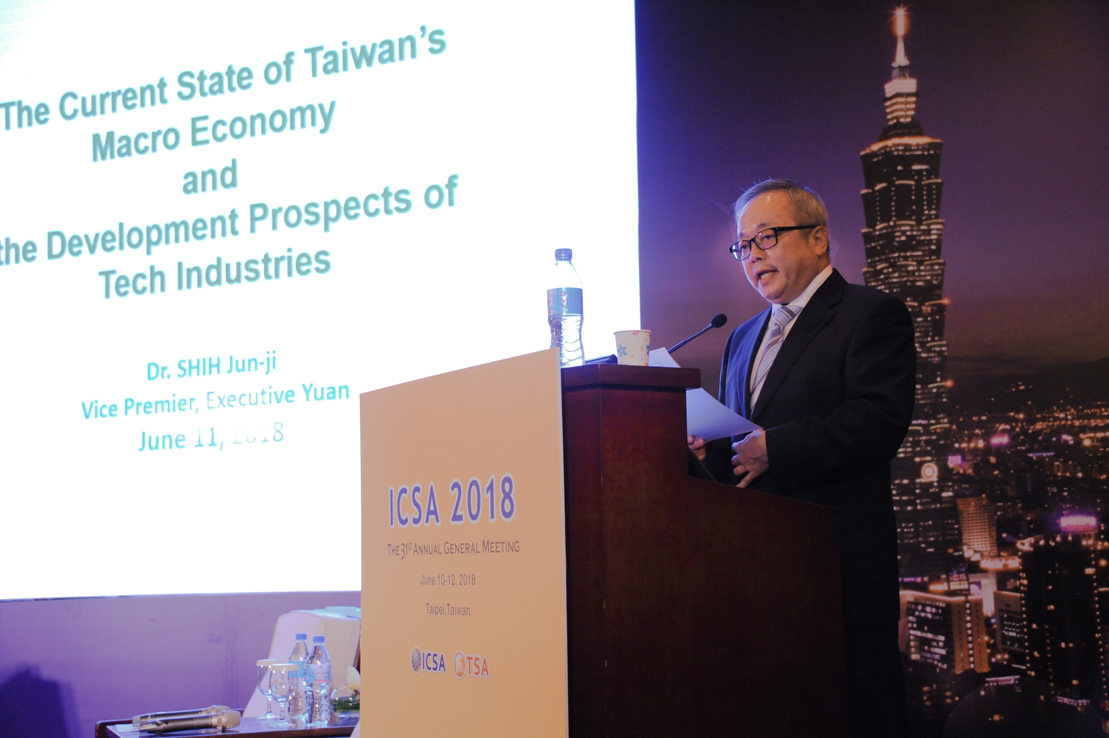 稍後,施副院長就「台灣總體經濟現狀與科技產業發展榮景」為題發表演說,施副院長表示,台灣是充滿活力的經濟體,去(106)年經濟成長率達到2.86%,是近3年來最佳,今(107)年第1季經濟成長率也突破3%。今年第1季的出口總值更是連續第6季呈現兩位數成長。而當前失業率平均為3.66%,為18年來最低點。種種數據顯示,台灣經濟指標非常健康有活力。
