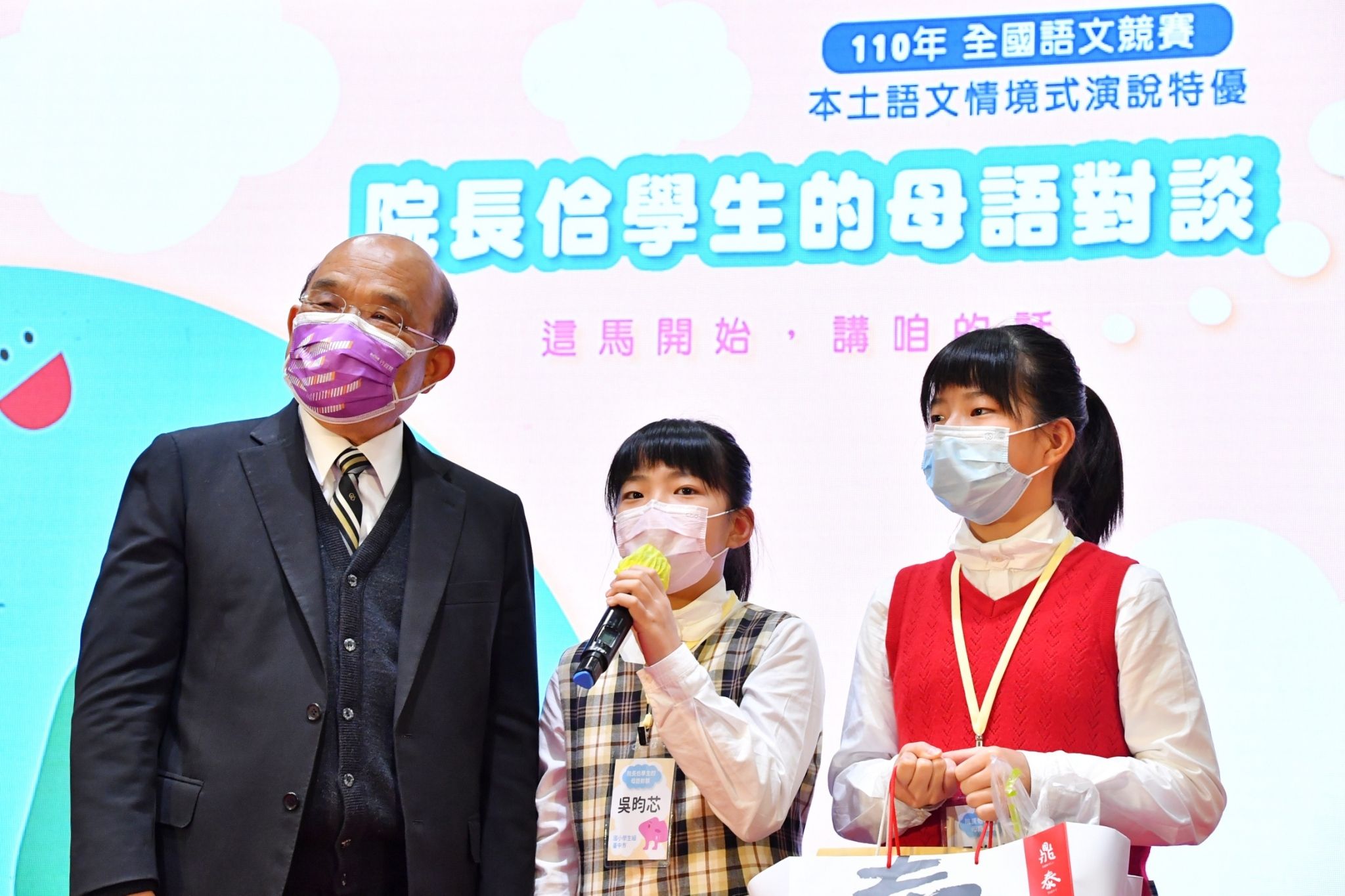 行政院長蘇貞昌今(16)日在行政院大禮堂接見全國各縣市台語演講優秀學生一行,全程以台語致詞及與現場來賓對話交流。蘇院長表示,一旦語言斷了,文化就會消失,因此我們有責任要保存各種母語,尤其臺灣是互相尊重的多元社會,不論華語、台語、客語、原住民族語皆應妥善保存和傳承,這是大家的責任。院長在聽取各得獎學生以流利的台語進行自我介紹和心得分享後,特別嘉許大家優異的表現,也感謝教育部潘文忠部長為推動台語保存所做的努力與改變,並強調只要有心持續使用母語,就能代代傳承、發揚光大。