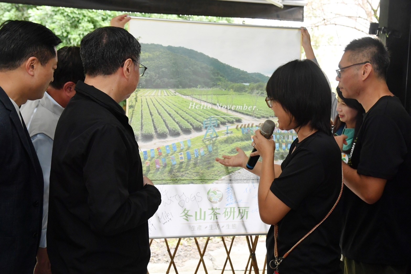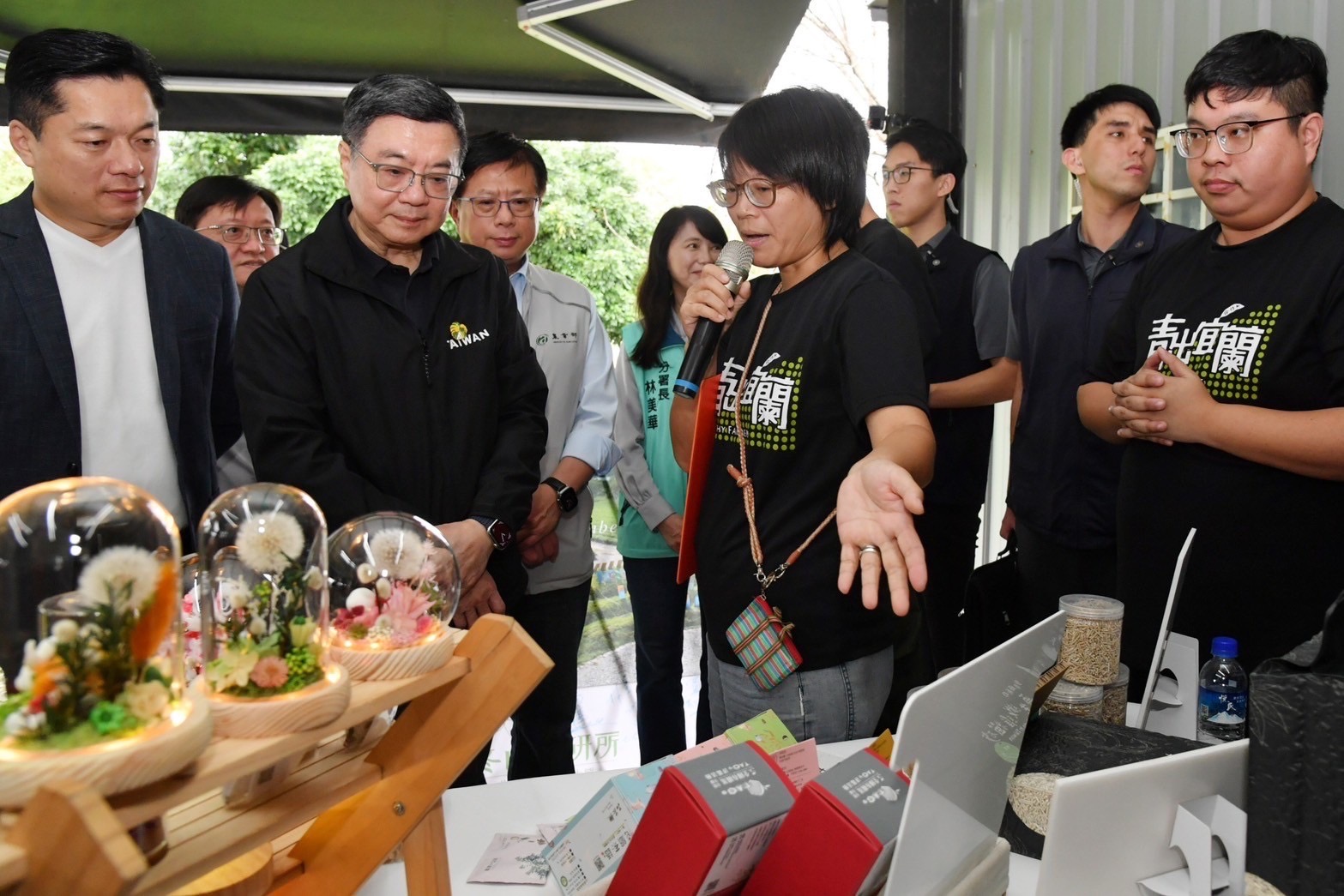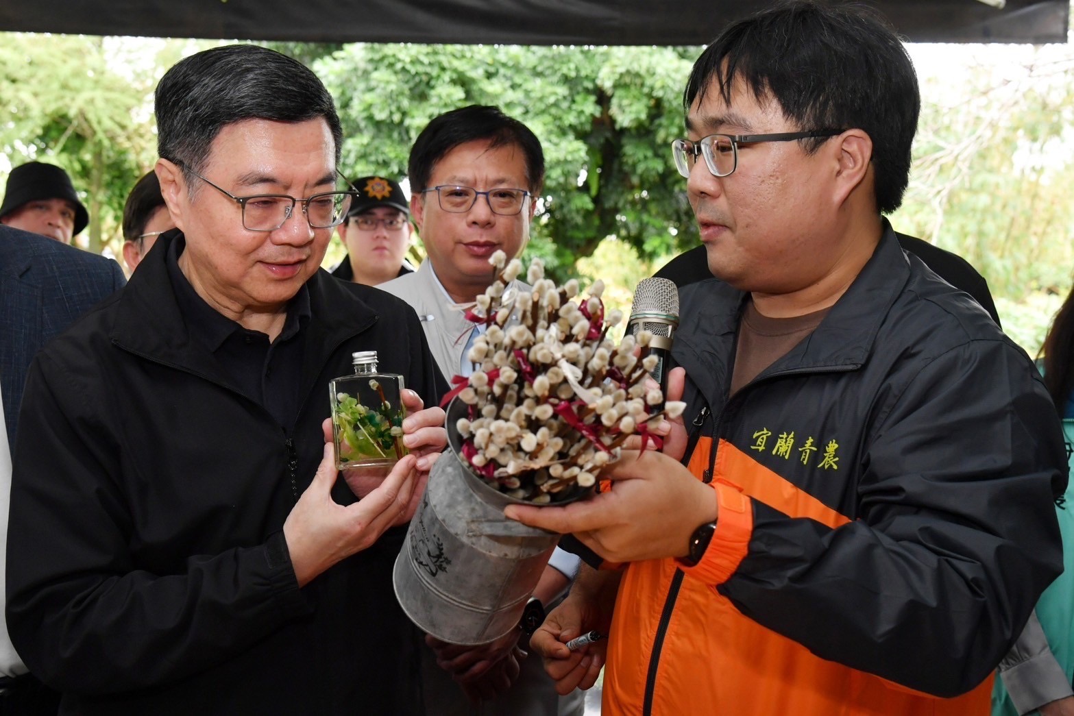 接續,卓院長偕同行政院龔明鑫秘書長、李慧芝發言人、農業部黃昭欽次長、農業部農糧署東區分署林美華分署長、農業部花蓮區農業改良場楊大吉場長、陳俊宇立委、宜蘭縣林姿妙縣長參觀農產品展示區,聽取宜蘭青農介紹盤龍參、銀柳、茶葉等在地農產品及農作物循環再利用方式,卓院長也對宜蘭縣優質農特產品給予高度肯定。最後,卓院長與青農們合影留念,並在林理事主席解說下,聽取三星蔥專業噴藥車介紹。