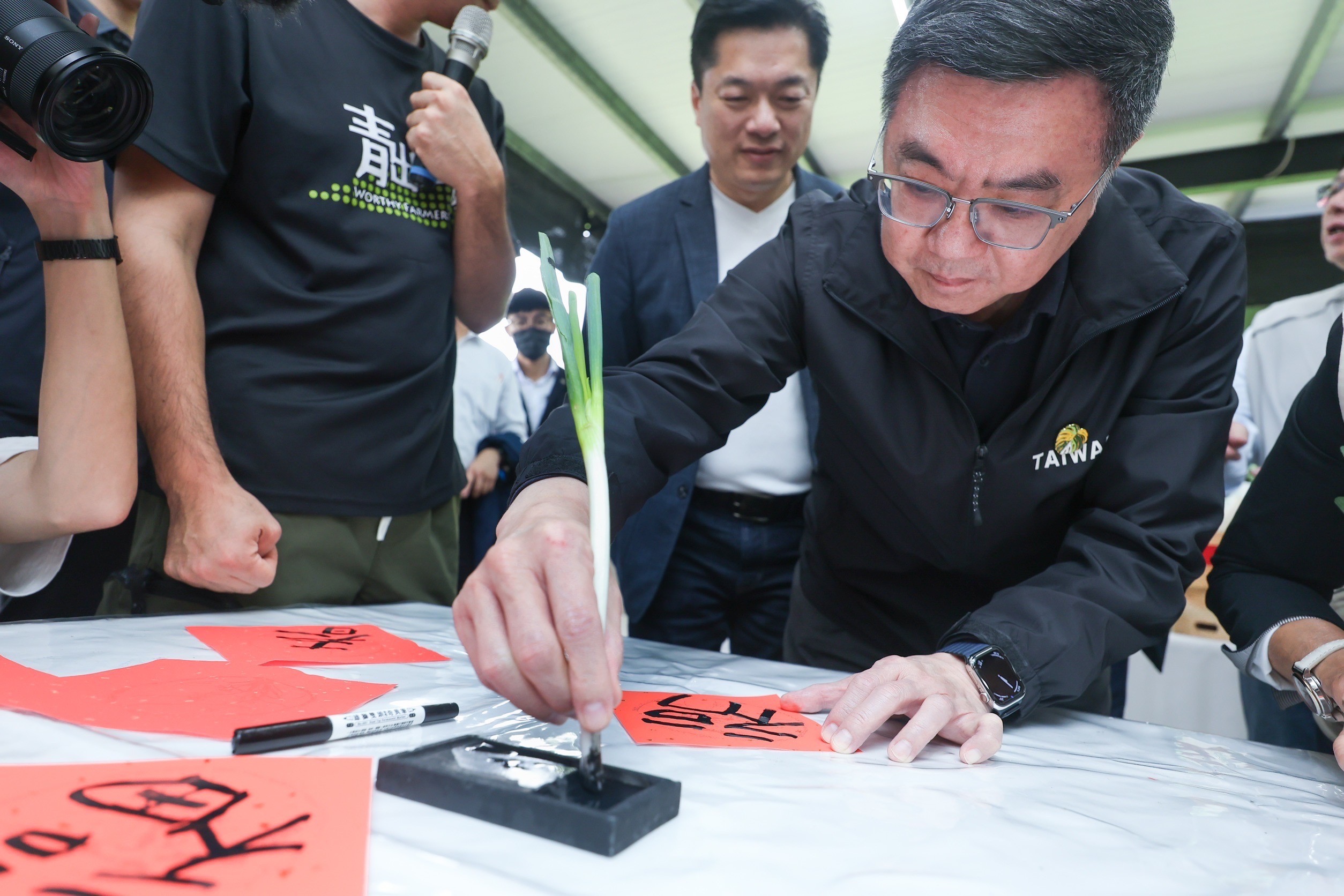 此行,卓院長抵達現場後,受到青農熱烈歡呼,隨後聽取宜蘭縣青出宜蘭農業運銷合作社林意評理事主席簡報說明該合作社成立背景,以及在智慧從農、韌性農業、ESG永續農村與安心食農等四面向工作推展成果。致詞結束後,卓院長與宜蘭縣林姿妙縣長進行食農體驗,手持青蔥在紅紙上揮毫,分別寫下「福」、「春」二字,博得滿堂喝采。