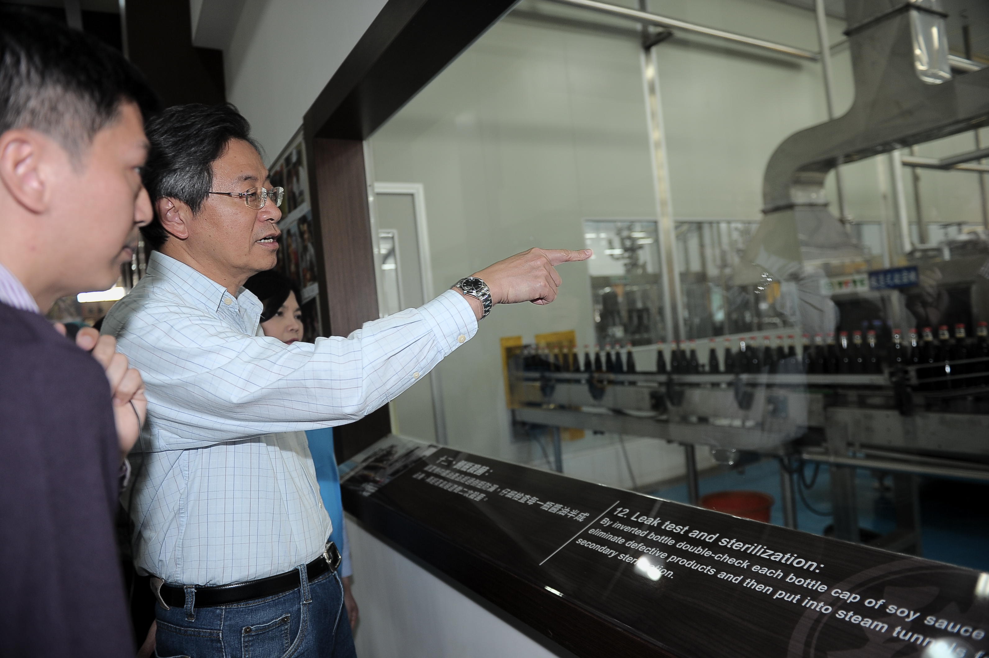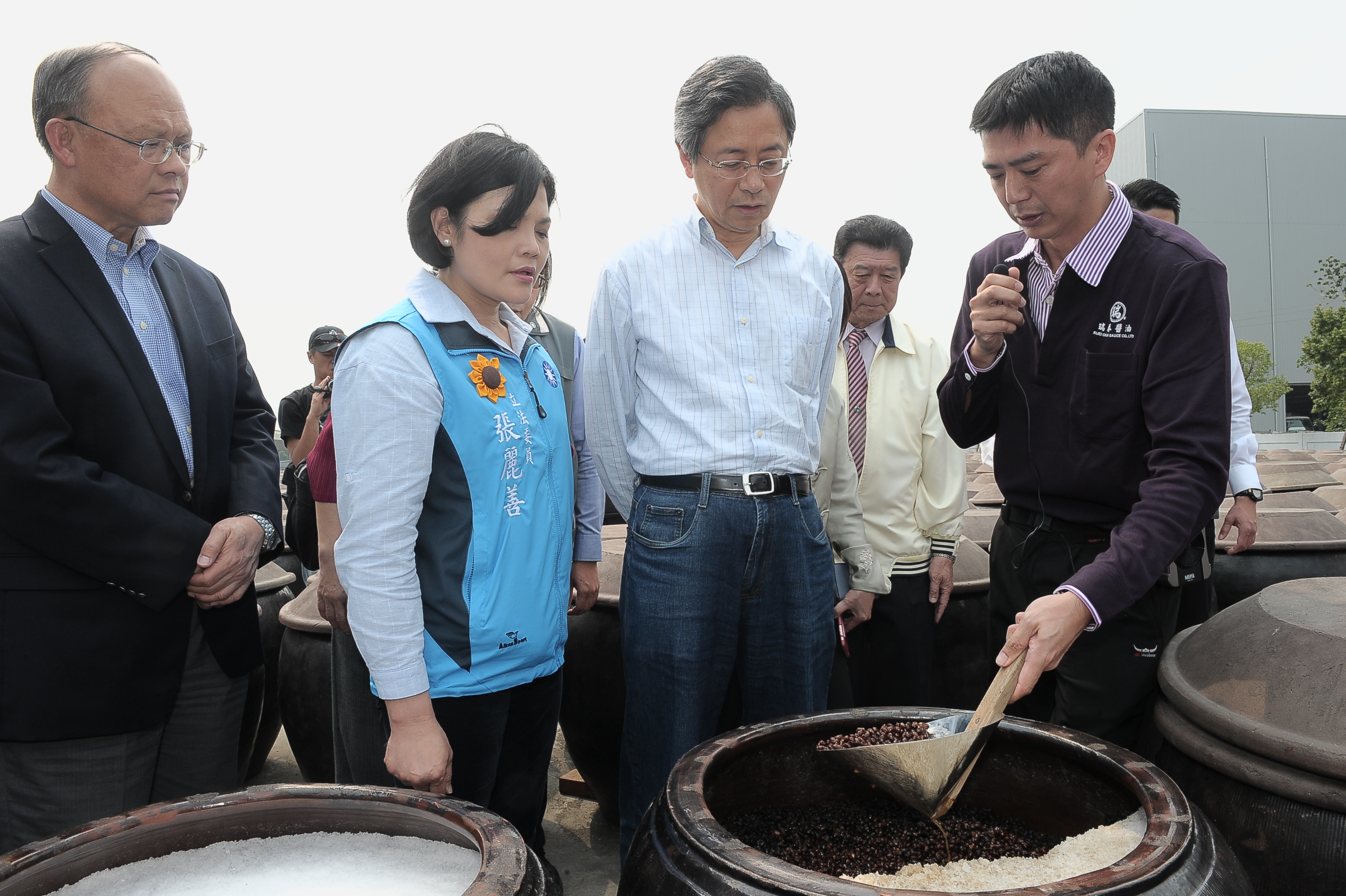 隨後,張院長至百年老店瑞春醬油有限公司參訪時,品嚐有趣的創新產品-臺灣黑豆醬油冰淇淋,對能在傳統中加入創新研發深感佩服。院長也在廠方的紀念小陶甕上簽名,並到甕場看醞釀的醬油麴。