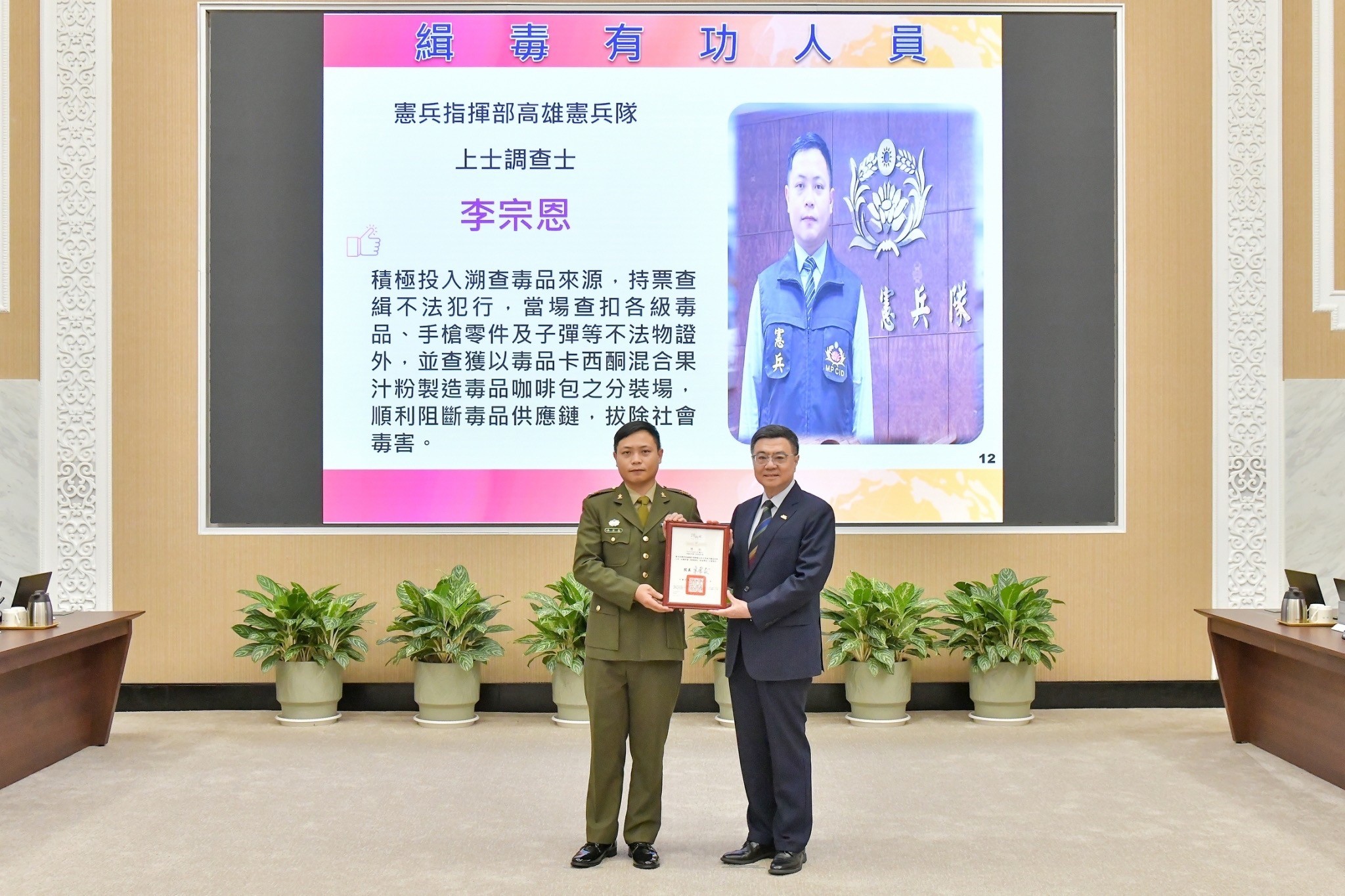 卓院長於會前首先頒獎表揚「第11波安居緝毒專案及重大緝毒案件」20位有功人員,並表示賴清德總統上任後,指示行政團隊在社會治安方面,落實「五打七安」政策,在檢、警、調、憲、海巡及關務「六大守護神」共同努力下,已展現具體成效。他強調,「零容忍」是政府及全國人民對毒品的唯一標準,面對來勢洶洶的新興毒品,法務部特別於今(2024)年11月14日召開毒品審議委員會,將「喪屍菸彈」依托咪酯類改列為第二級毒品,提高罰則並嚴格執法,進一步壓制毒駕肇事等毒品犯罪。